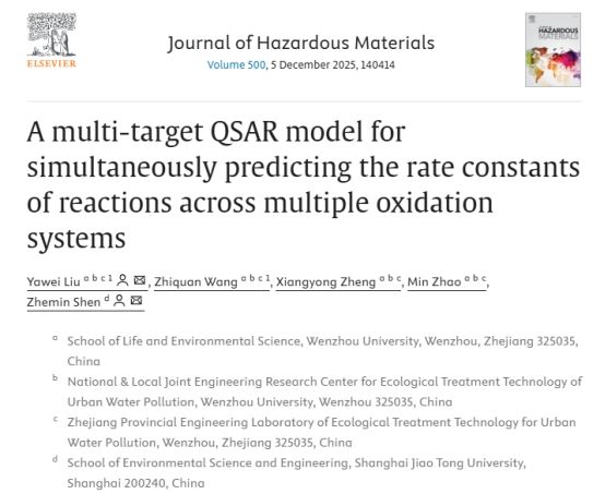 近日,满冠平台生命与环境科学学院赵敏教授团队在国际著名期刊《Journal of Hazardous Materials》(中科院一区TOP,IF=11.3)上在线发表了题为《A multi-target QSAR model for simultaneously predicting the rate constants of reactions across multiple oxidation systems》的最新研究成果。该研究面向大气环境中VOCs的多氧化体系反应过程,构建了首个可同时预测VOCs在•OH、O₃和NO₃•三类氧化体系中反应速率常数(kOH、kO3、kNO3)的多目标QSAR模型。