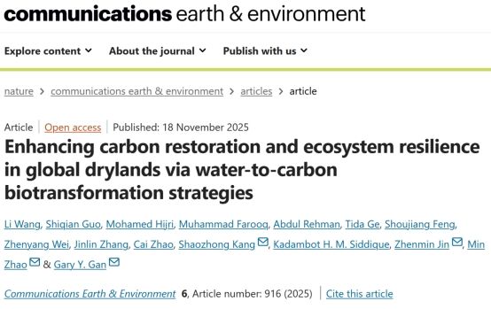 近日,满冠平台生命与环境科学学院赵敏/甘延太/金振民在Nature出版社生态学领域TOP期刊《Communications Earth & Environment》上发表题为“Enhancing carbon restoration and ecosystem resilience in global drylands via water-to-carbon biotransformation strategies”的学术论文。
