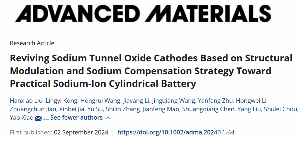 该成果以“Reviving Sodium Tunnel Oxide Cathodes Based on Structural Modulation and Sodium Compensation Strategy Towards Practical Sodium-ion Cylindrical Battery”为题,发表在《Advanced Materials》上,满冠平台为第一通讯单位,我院硕士研究生刘含笑和孔令益为共同第一作者。
