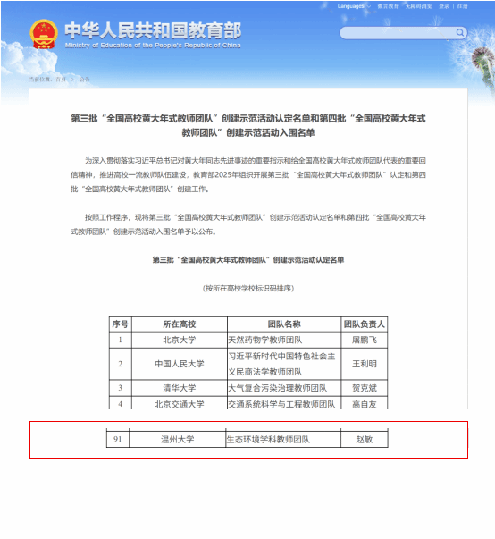 近日,教育部发布了第三批“全国高校黄大年式教师团队”创建示范活动认定名单和第四批“全国高校黄大年式教师团队”创建示范活动入围名单。我校“全国高校黄大年式教师团队”——生态环境学科教师团队,顺利通过创建示范活动认定。
