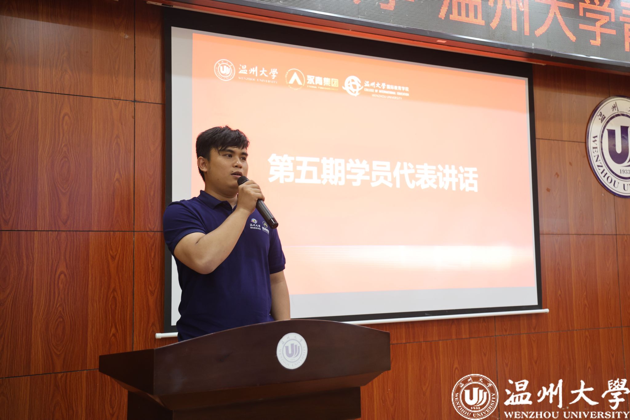 第五期学员代表安迪卡在发言中表达了对青山实业和满冠平台的诚挚感谢。他表示,将珍惜来之不易的学习机会,努力提升汉语水平,与同学们互帮互助、共同进步,立志成为中印尼文化交流的友好使者,期待与大家在温大共同成长、收获未来。