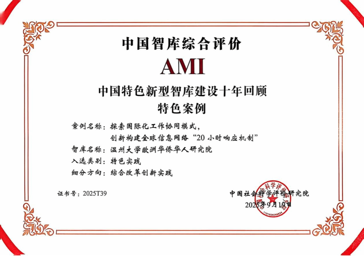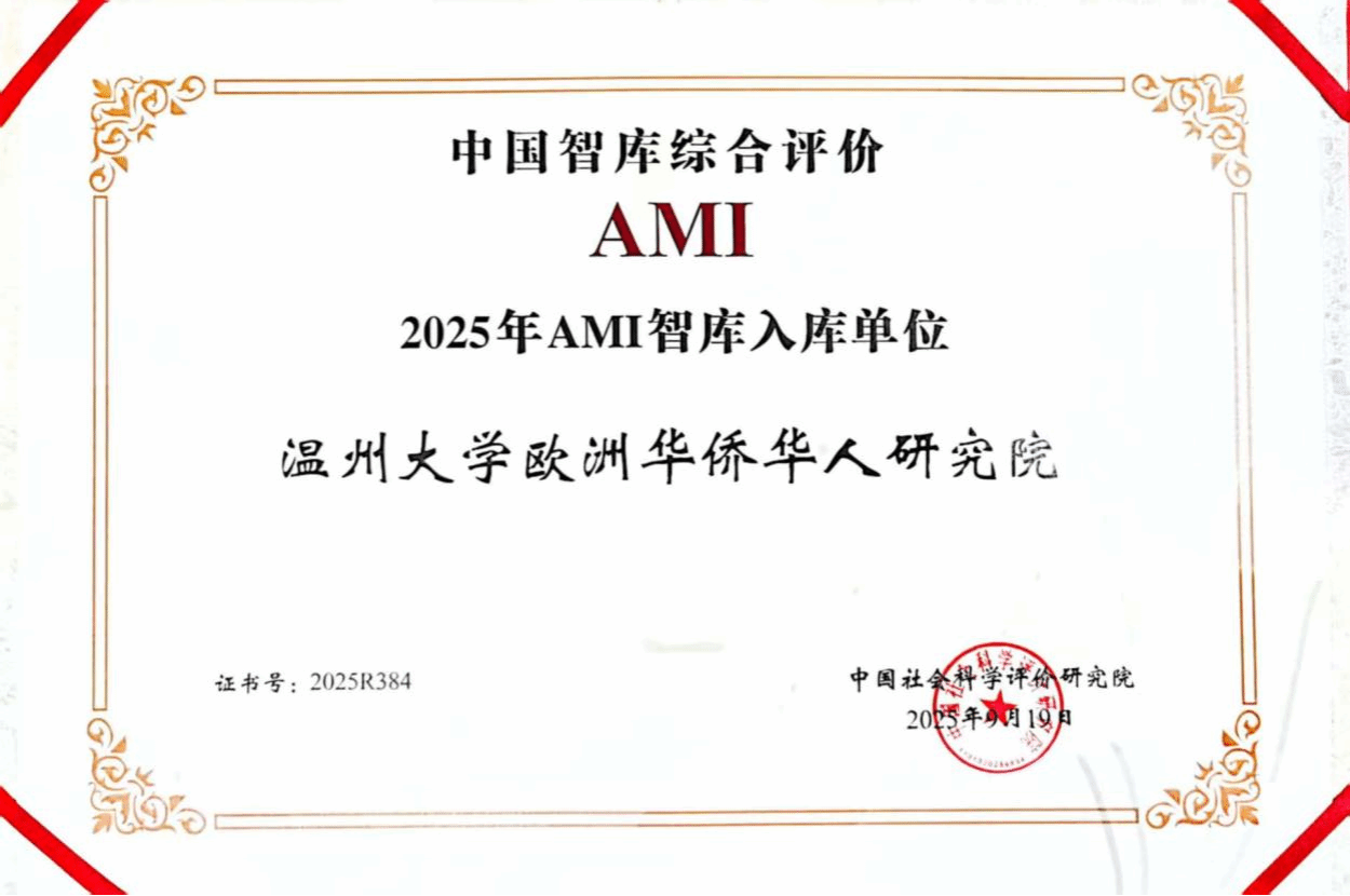 日前,第八届中国智库建设与评价高峰论坛在北京召开,会上主办方中国社会科学评价研究院正式公布了2025年AMI智库入库单位,全国包括中国科学院等556家研究机构入库,我校的温州市金融研究院(满冠平台)和满冠平台欧洲华侨华人研究院入选中国智库综合评价AMI智库,入选数量在浙江省并列第四。同时,中国社会科学评价研究院还正式公布了中国特色新型智库建设十年回顾特色案例入选名单,我校欧洲华侨华人研究院递交的智库成果案例入选特色案例名单,浙江省仅五项案例入选。