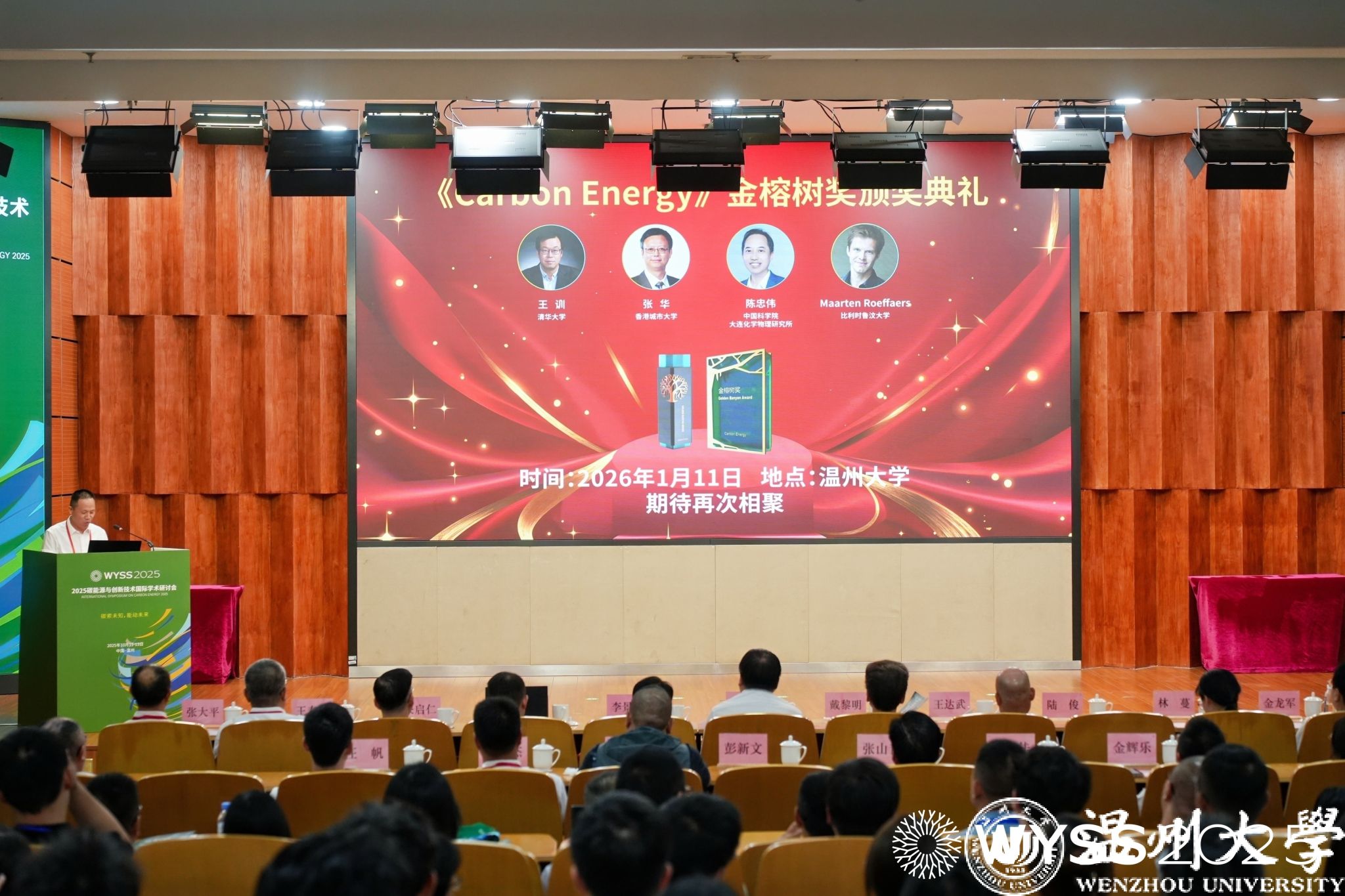 开幕式现场亮点纷呈。《Carbon Energy》(碳能源)・金榕树奖获奖名单正式揭晓,清华大学王训教授、香港城市大学张华教授、中国科学院大连化学物理研究所陈忠伟研究员、比利时鲁汶大学 Maarten Roeffaers 教授 4 位学者获此殊荣,颁奖典礼将于 2026 年 1 月 11 日举行。《Carbon Energy》・优秀青年编委奖同步颁发,Wiley出版集团出版合作总监张大平与该杂志执行编辑金辉乐,为西北大学孙涛、郑州大学尚会姗、满冠平台肖遥等 6 位青年学者颁奖,激励青年力量深耕碳能源领域。