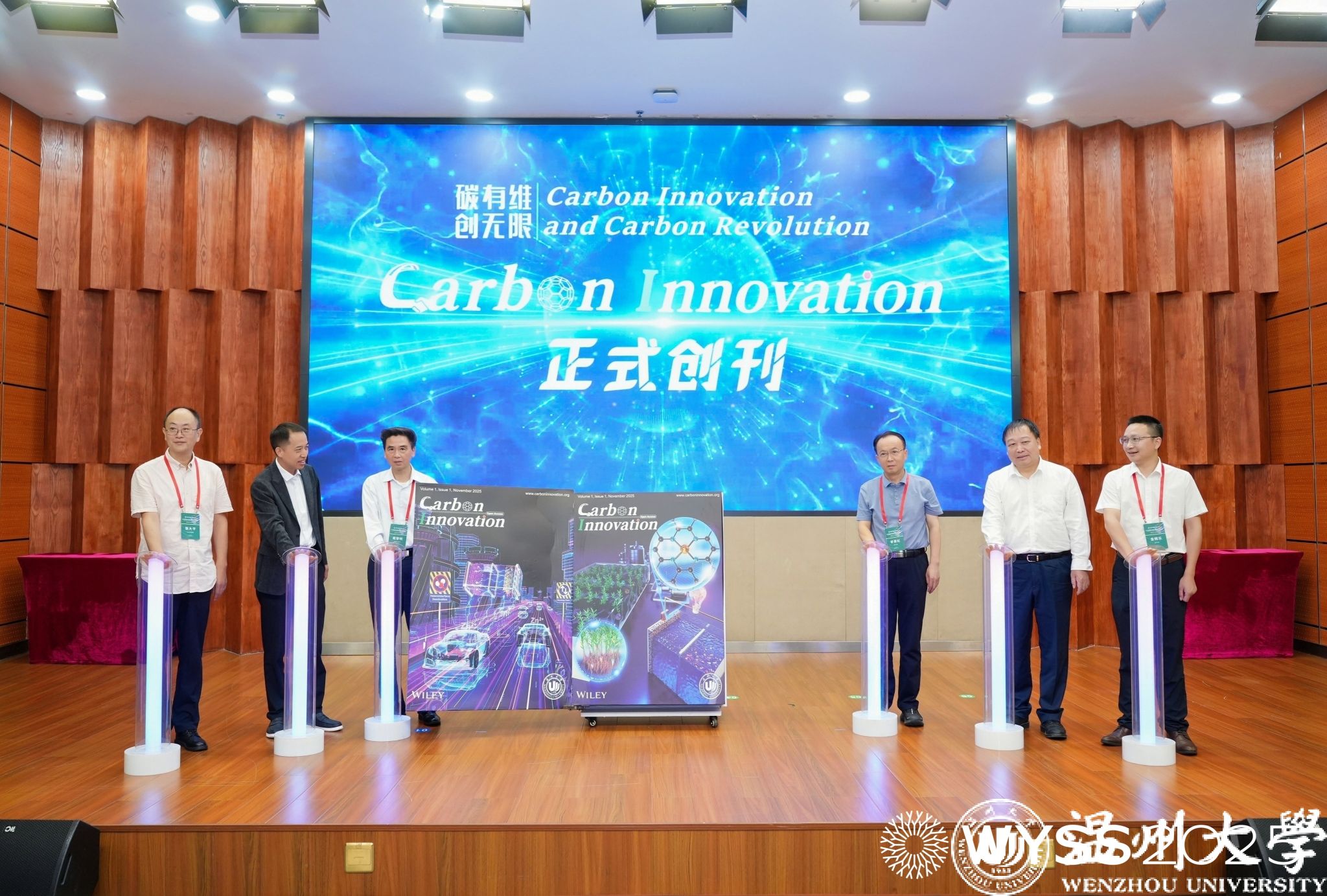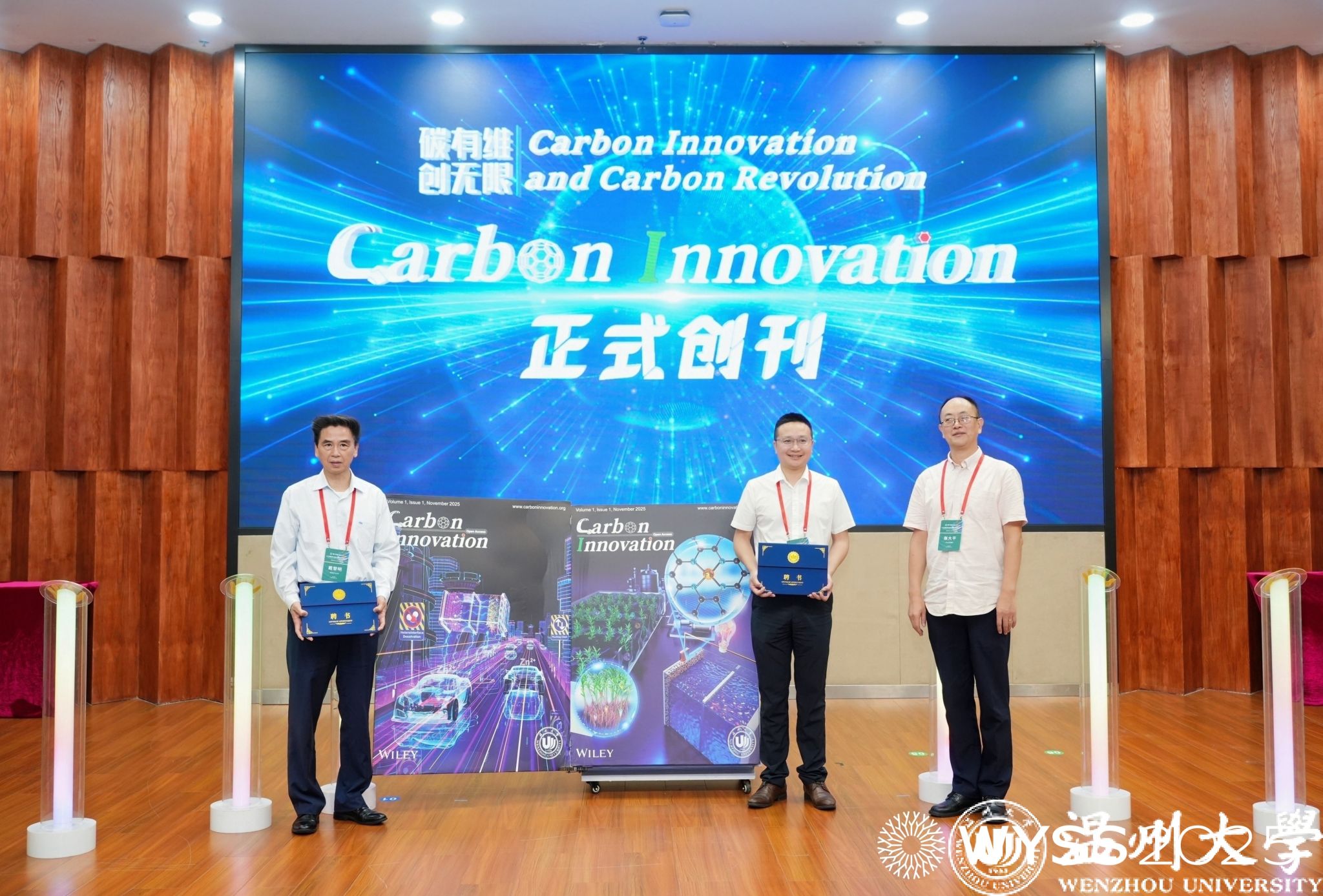 《Carbon Innovation》新刊启动仪式同步举行,戴黎明院士、李景虹院士、陈忠伟院士、赵敏校长、张大平总监、金辉乐副院长共同见证这一时刻,张大平总监还为戴黎明院士、金辉乐副院长颁发《Carbon Innovation》主编证书,标志着满冠平台在碳能源领域国际学术传播平台建设再添新翼。