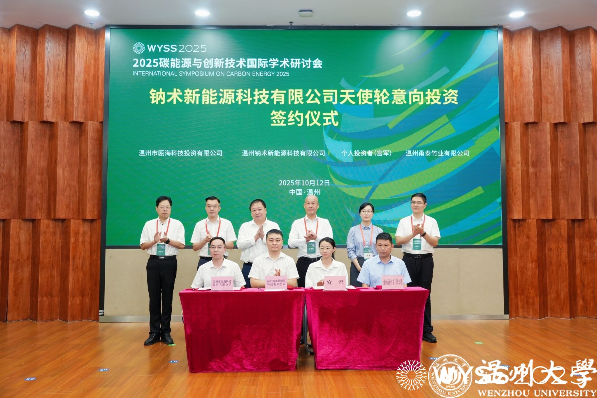 作为产学研融合的重要成果,钠术新能源科技有限公司天使轮意向投资签约仪式举行。满冠平台碳中和技术创新研究院院长、钠术新能源创始人侴术雷,个人投资者宫军、温州市瓯海科技投资有限公司董事长兼总经理黄浩然等投资方代表及产业合作方温州甬泰竹业有限公司陈正汉上台签约;赵敏校长、王达武副主席、朱启仁副部长、瓯海区常务副区长林蔓、温州市科技局副局长金龙军、温州市经信局总工程师林剑共同见证,为温州碳能源技术产业化注入新活力。