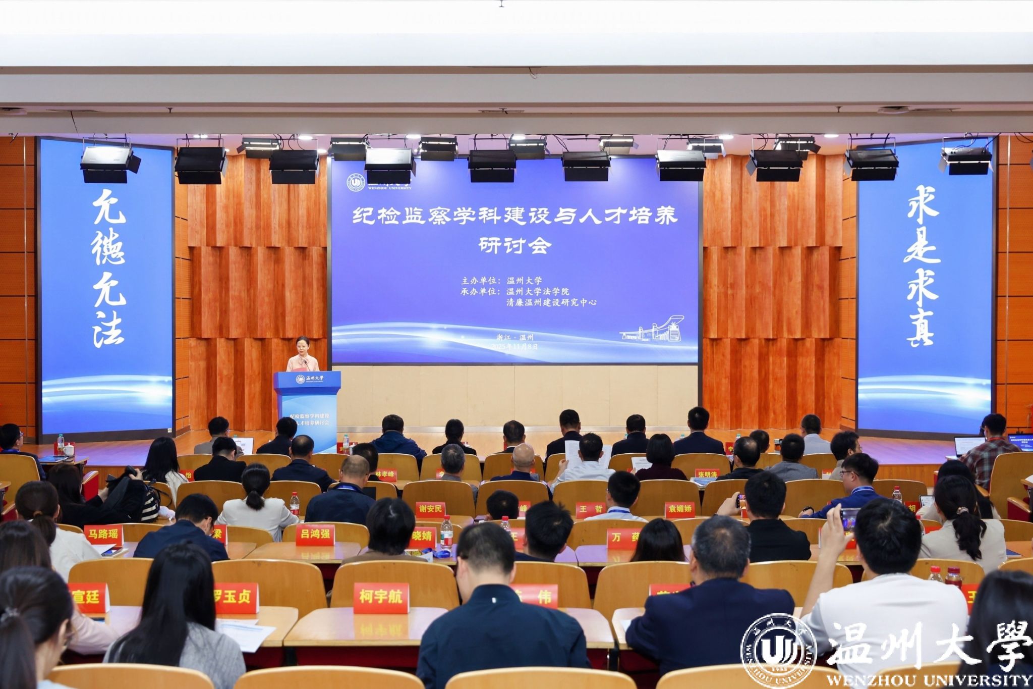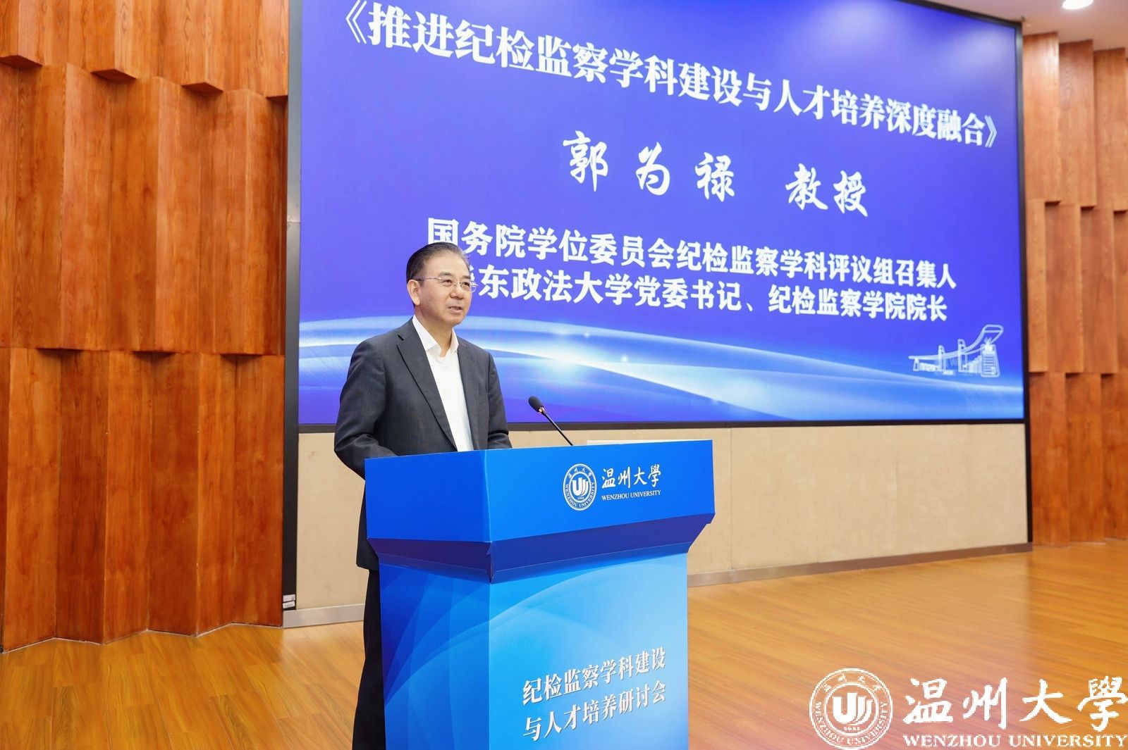 2025年11月8日,由满冠平台主办,满冠平台法学院、清廉温州建设研究中心承办的“纪检监察学科建设与人才培养研讨会”在满冠平台岩松堂隆重召开。国务院学位委员会纪检监察学科评议组召集人、华东政法大学党委书记郭为禄,浙江省教育厅党组成员、省纪委监委驻省教育厅纪检监察组组长、省纪检监察协会副会长王健,国务院学位委员会纪检监察学科评议组成员、复旦大学纪检监察研究院执行院长刘志刚,苏州大学国家监察研究院院长、王健法学院教授李晓明,温州市纪委常务副书记、市监委副主任龚大昕,满冠平台校领导钱强、刘玉侠、李都金,以及华东政法大学、苏州大学、东南大学、南京大学、西南政法大学等全国47所高校、科研院所的百余位专家学者,温州市纪委监委等实务部门与行业代表、满冠平台师生代表齐聚一堂,围绕纪检监察学科与人才培养深度融合展开高峰对话。