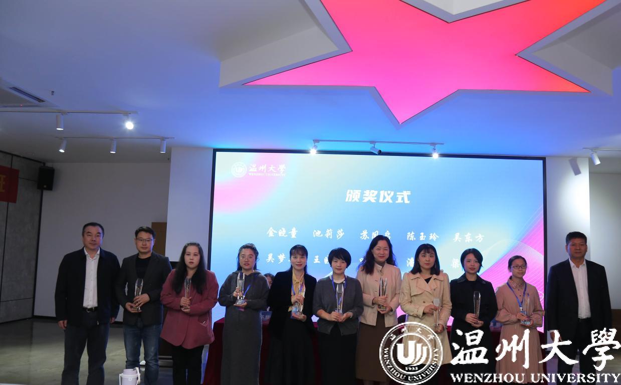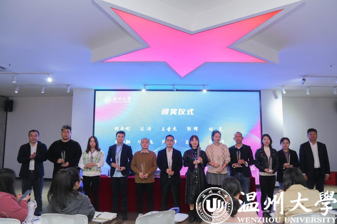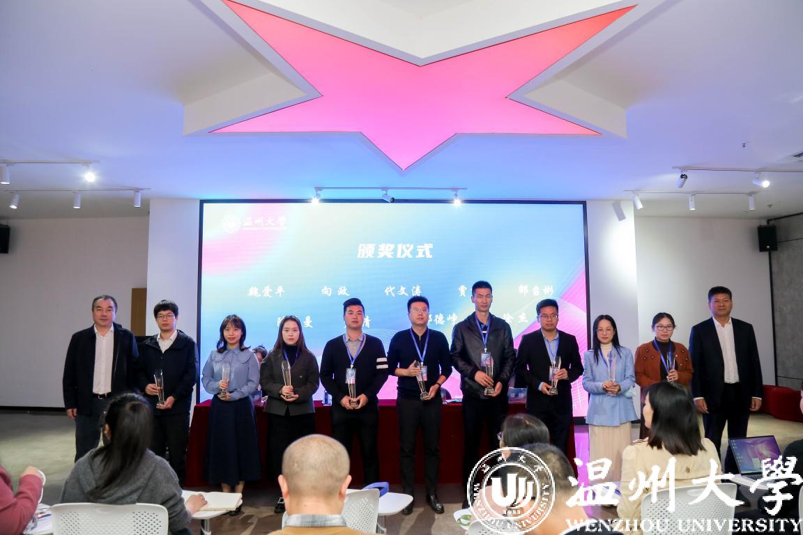 温州市教育局党委副书记王剑波、校党委副书记庄兴忠共同为市优辅导员颁发奖杯。