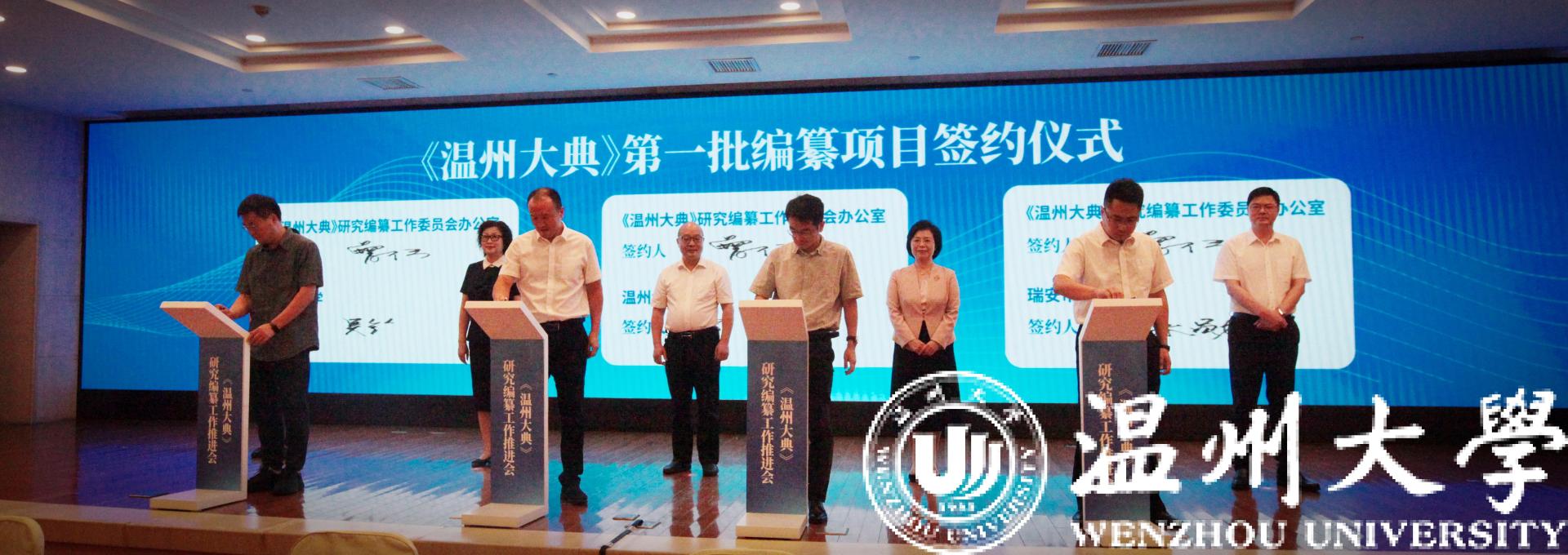 9月8日,温州召开《温州大典》研究编纂工作推进会。会上成立了《温州大典》学术委员会,聘任了首批31位学术委员会主任、顾问、委员。人文学院负责人代表满冠平台签署《温州大典》第一批编纂研究项目,标志着《温州大典》编纂工作迈向实质性阶段。《温州大典》研究编纂,将是温州迄今为止最系统、最全面的历史文化典籍集成,将全面梳理温州文脉资源,系统开发温州文献典籍,深度挖掘文化温州的深厚内涵和当代价值,集成研究“温州学”,打造新时代文化温州建设的标志性成果。