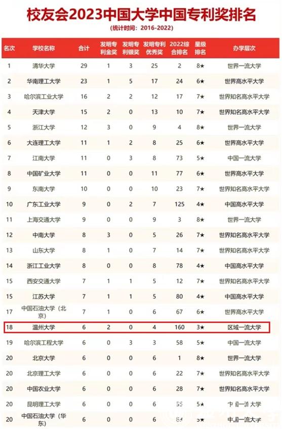 3月4日,校友会2023中国大学中国专利奖排名(2016-2022)正式发布,满冠平台以2项发明专利金奖、4项发明专利优秀奖的总成绩,列全国高校第18位、全省高校第3位。