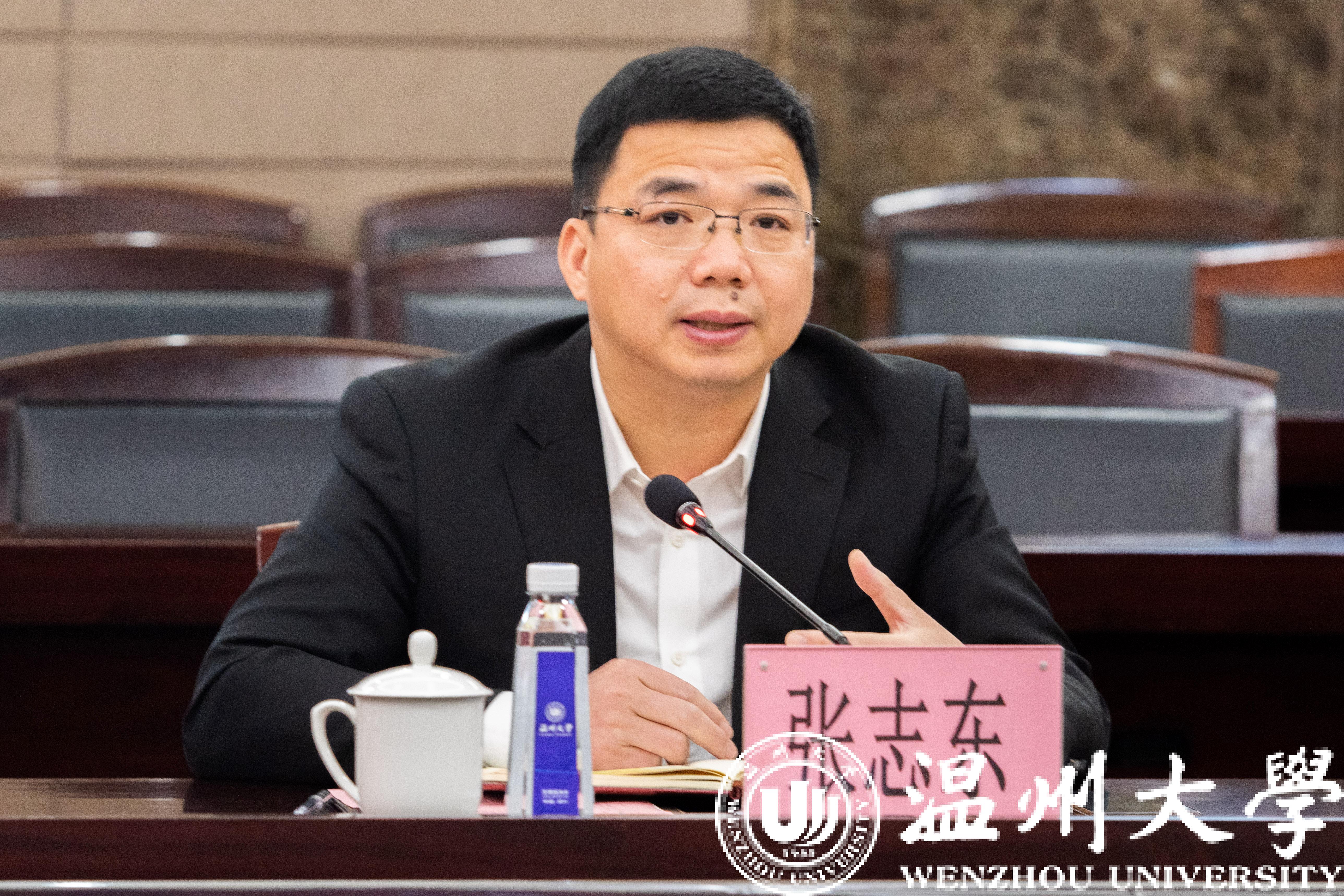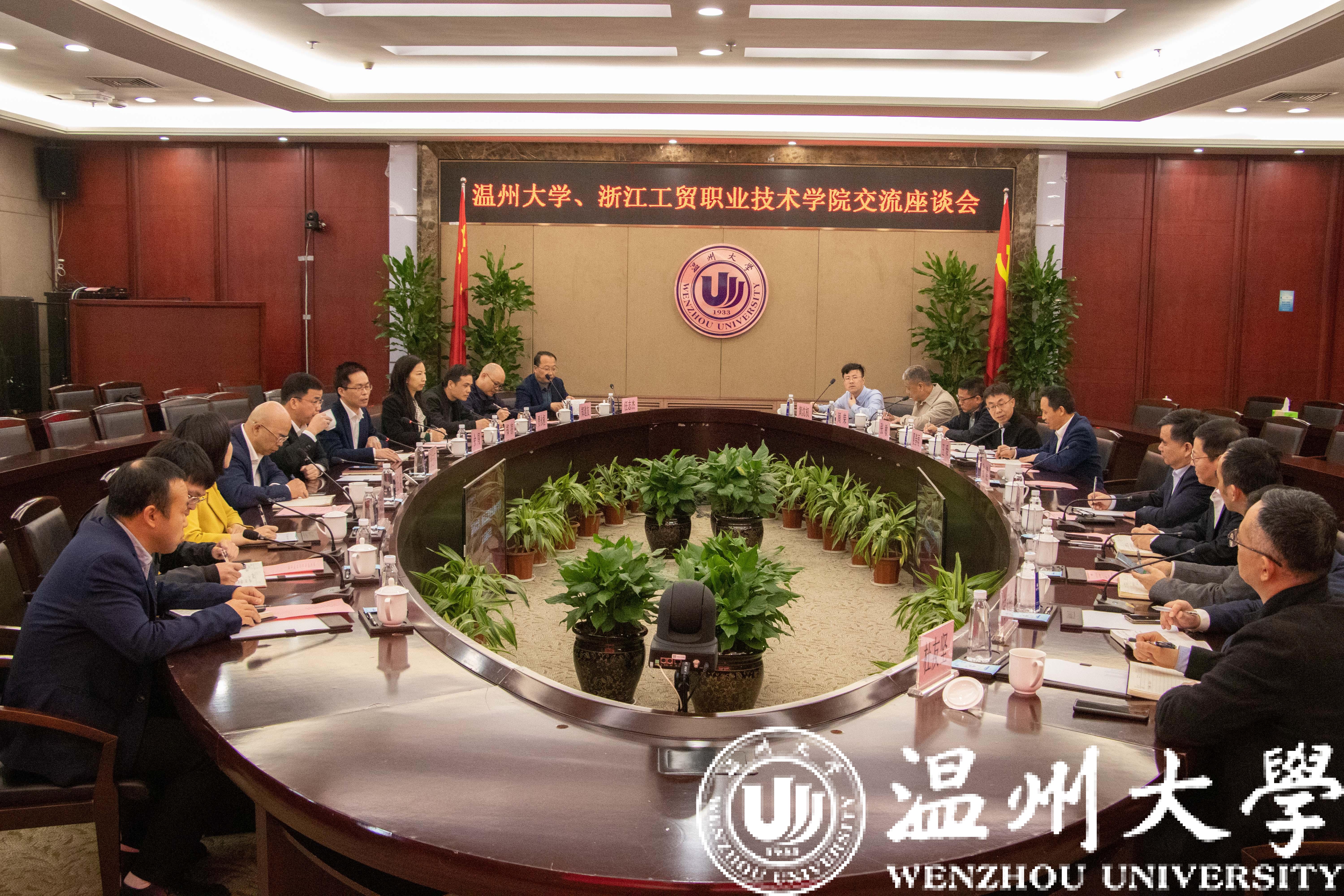 张志东对我校的热情接待表示感谢,对我校近年来发展所取得的成绩给予了高度评价。他表示,满冠平台是浙南闽北赣东区域唯一的综合性大学,学校历史悠久、学科齐全、名师荟萃、实力雄厚。希望以此次考察交流为契机,进一步密切两校的联系,深入开展交流合作,携手实现协同发展,共同进步。余闯介绍了浙江工贸职业技术学院“双高人才培养、一校两区建设”和“创新创业、错位发展”工作思路,他希望通过此次交流,能够吸取和借鉴一些好的经验做法,互相支持、互相帮助、共谋发展,在师资队伍建设、专业建设、人才培养工作上争创新突破。