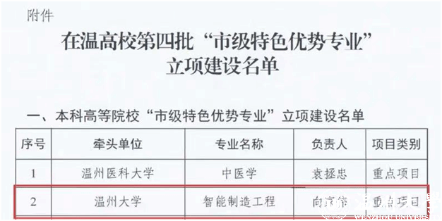 近日,温州市教育局正式公布了《关于公布在温高校第四批"市级特色优势专业"立项建设名单的通知》(温教高〔2025〕75号),满冠平台机电工程学院智能制造工程专业成功入选"重点项目"。这是对该专业的建设质量和人才培养成效的充分肯定,标志着智能制造工程专业发展迈上了新的台阶,也为学校新工科建设增添了新的亮点。