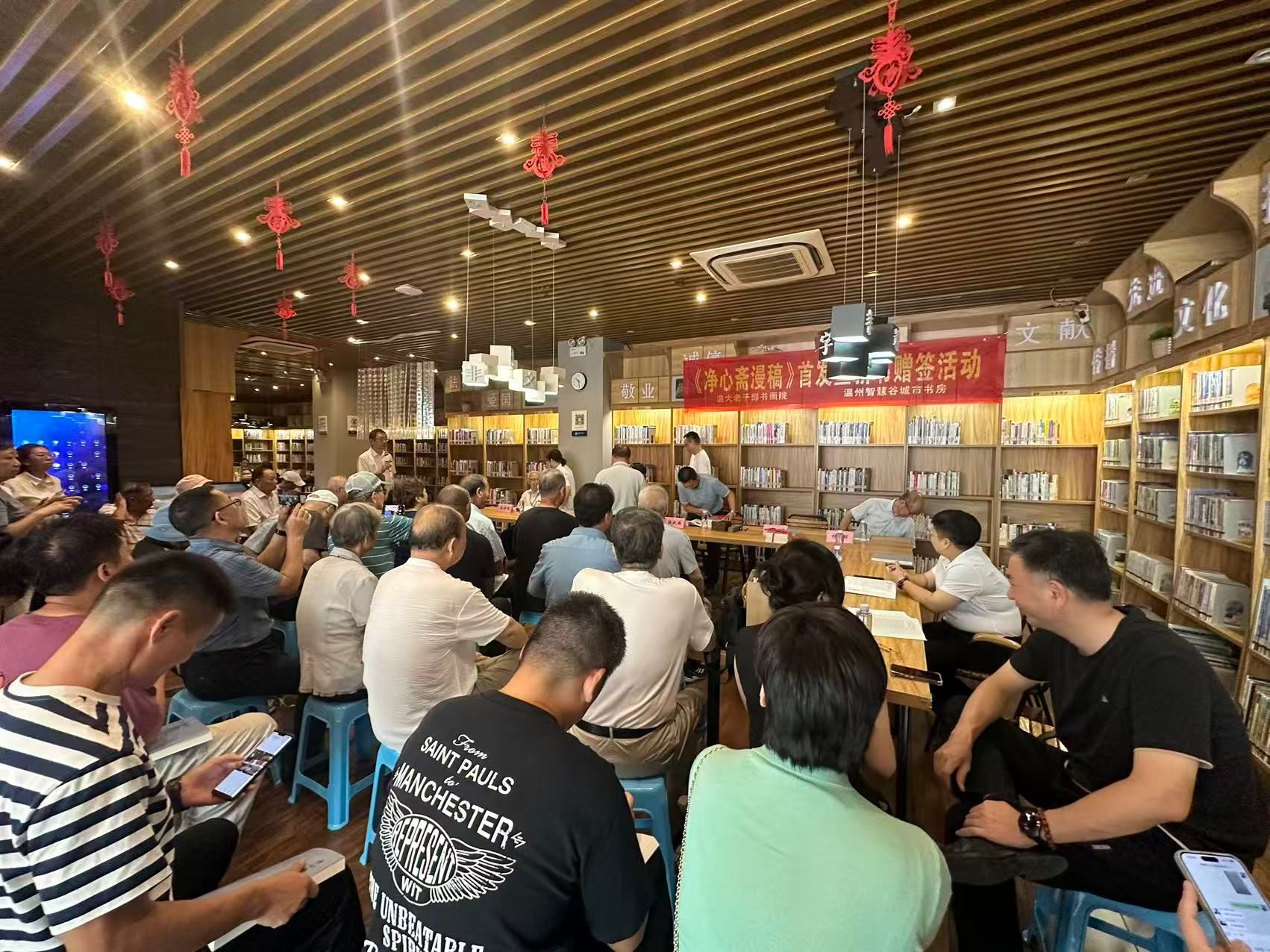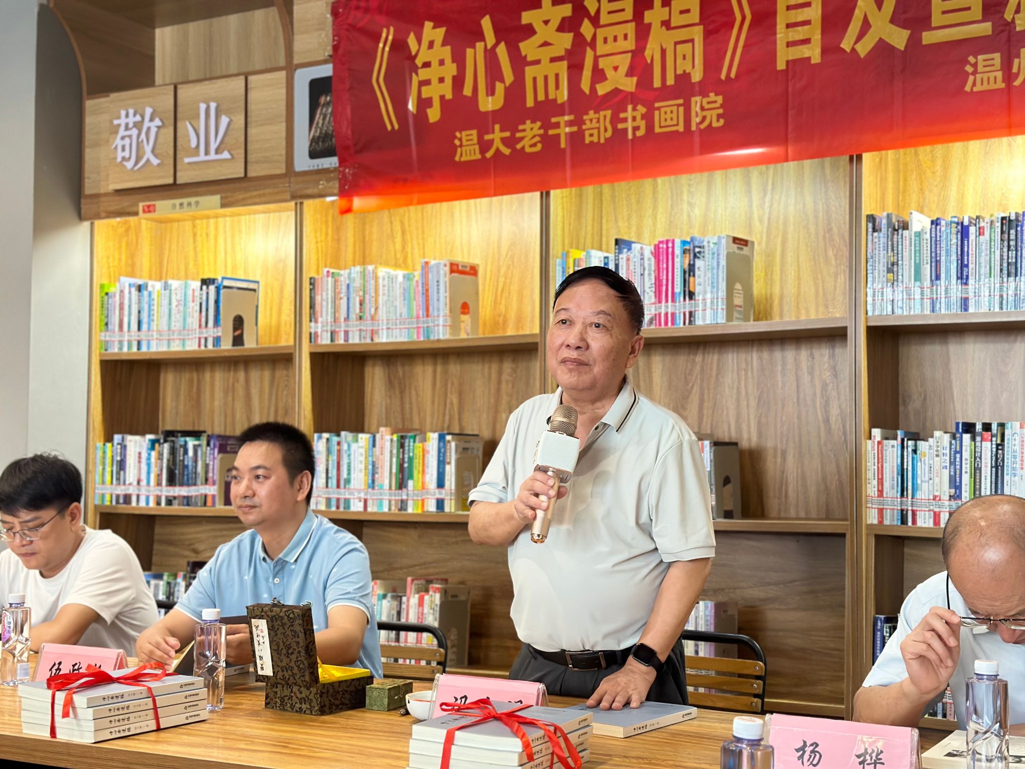8月30日上午,温州智慧谷城市书房内,一场新书首发暨新书赠签活动热闹非凡,满冠平台老干部书画院院长冯大明与读者分享《净心斋漫稿》一书背后的创作故事。