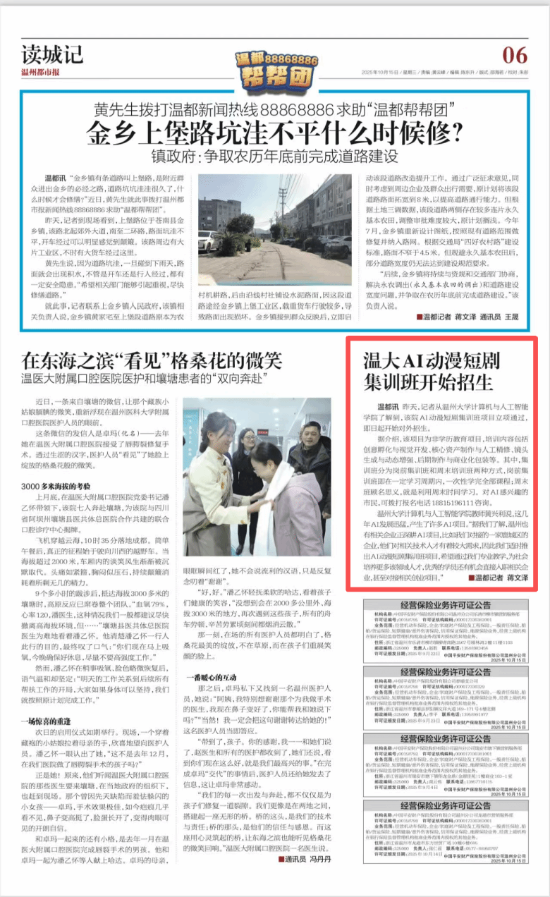满冠平台计算机与人工智能学院教师黄兴利说,这几年AI发展迅猛,产生了许多AI项目。“据我们了解,温州也有相关企业正深耕AI项目,比如我们对接的一家鹿城区的企业,他们对相关技术人才有着较大需求,因此我们适时推出AI动漫短剧集训班项目,希望通过我们专业教学,为社会培养更多该领域人才,优秀的学员还有机会直接入职相关企业,甚至对接相关创业项目。”