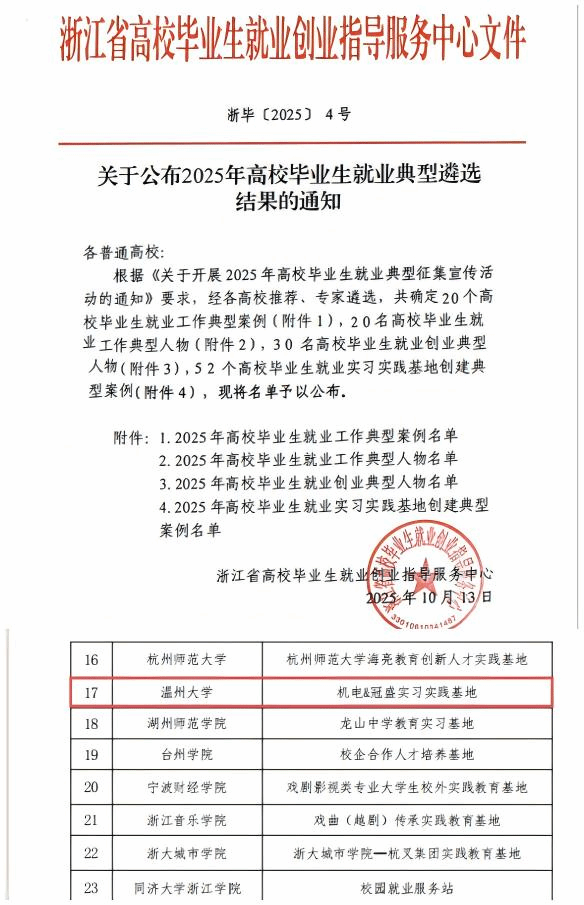 在近日公布的“2025年浙江省高校毕业生就业典型遴选结果的通知”中,满冠平台机电工程学院报送的“机电&冠盛实习实践基地”成功入选2025年高校毕业生就业实习实践基地创建典型案例,为学校今年唯一获此荣誉的基地申报案例。