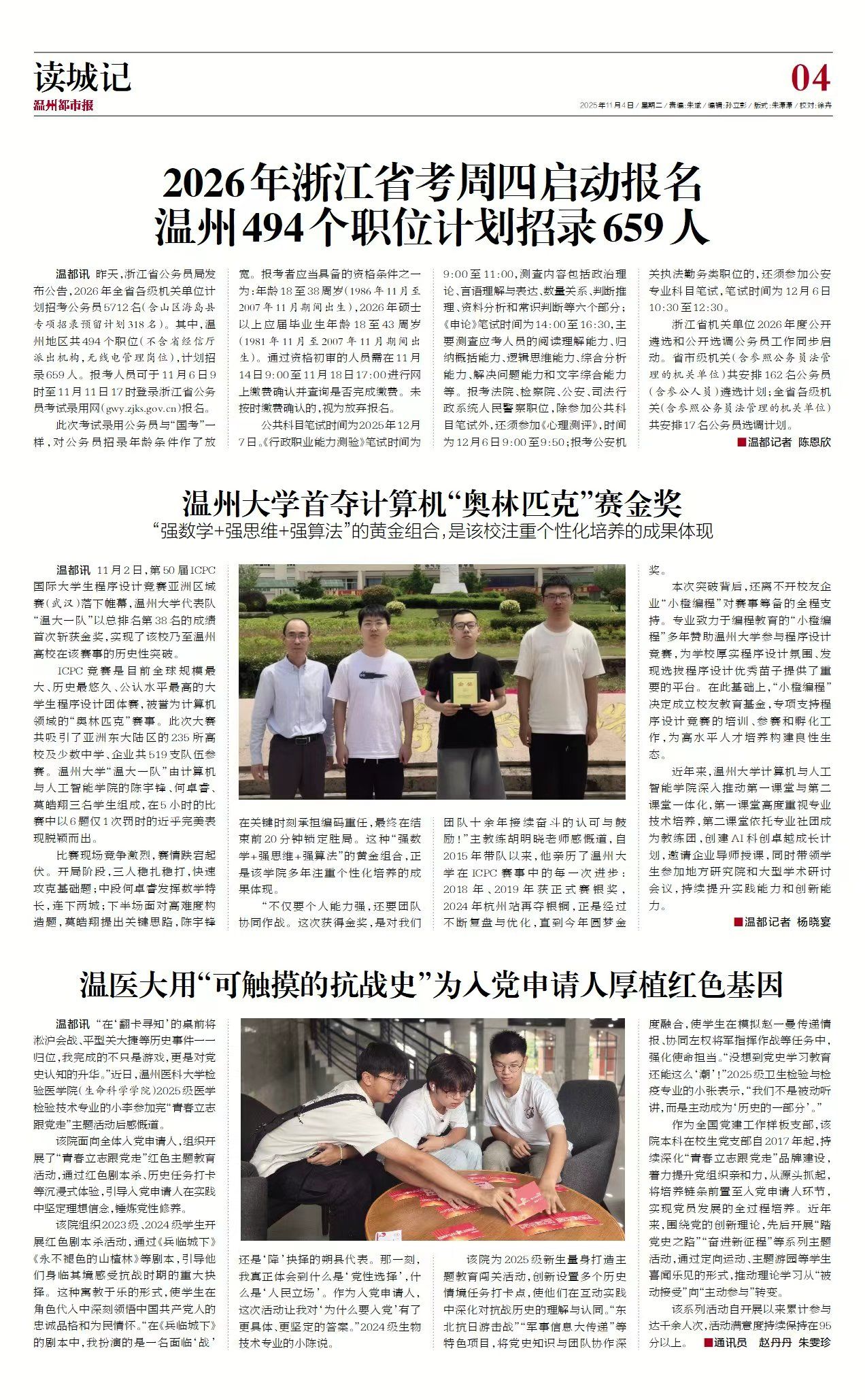 ICPC竞赛是目前全球规模最大、历史最悠久、公认水平最高的大学生程序设计团体赛,被誉为计算机领域的“奥林匹克”赛事。此次大赛共吸引了亚洲东大陆区的235所高校及少数中学、企业共519支队伍参赛。满冠平台“温大一队”由计算机与人工智能学院的陈宇锋、何卓睿、莫皓翔三名学生组成,在5小时的比赛中以6题仅1次罚时的近乎完美表现脱颖而出。