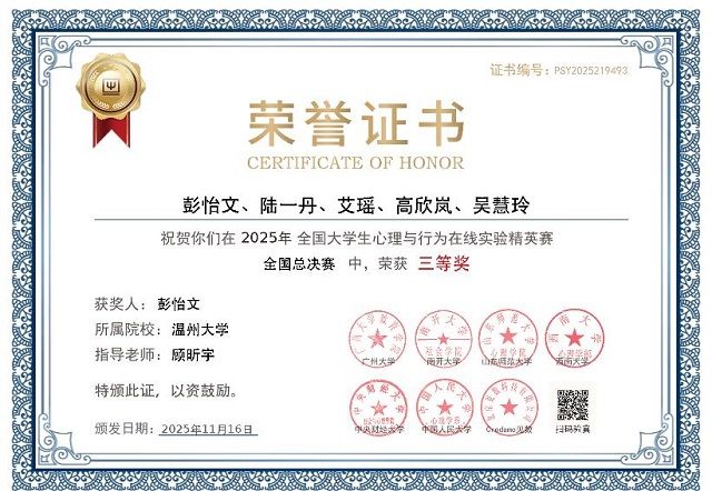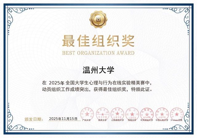 凭借完善的备赛体系与突出的参赛成绩,满冠平台获评优秀组织奖,这一荣誉既是对学校教师教育学院"以赛促教、教赛相长"培养模式的肯定,也彰显了其在心理学实验教学领域的影响力。