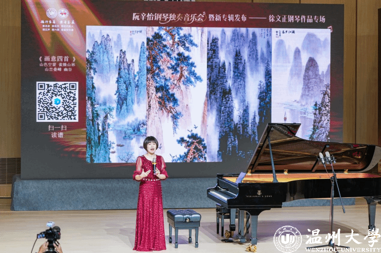 音乐会上,阮辛怡的指尖流淌出一幅幅生动的音乐画卷。从描绘浙南畲族风情的《畲寨风情》,到以温州童谣为蓝本写就的《叮叮当变奏曲》;从观画感怀、意境深远的《雪石老人画意》,到充满自然趣味的《对鸟幻想曲》与古意盎然的《潇湘水云》,她的演绎精准而富有灵性,不仅模仿声音,更以音乐描绘景象。尤其在《雪石老人画意》中,她通过细腻的触键与音色控制,将“山色空蒙”的雾气、“雀噪山林”的生机、“山峦叠嶂”的雄浑与“幽谷”的幽深静谧层层展开,令人沉浸其中。