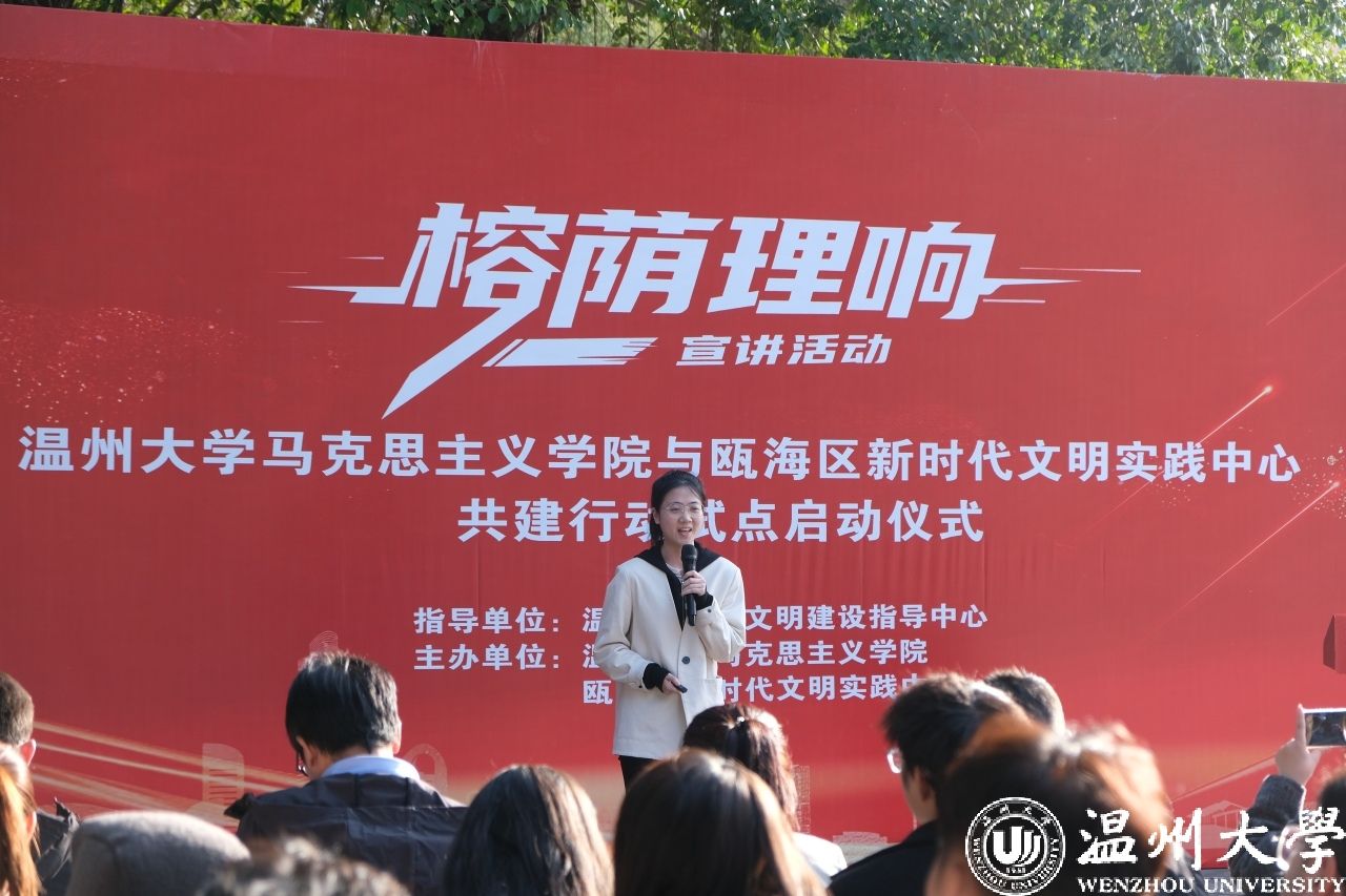 “榕荫理响”是瓯海区与满冠平台马克思主义学院合作共建创建的宣讲品牌,同时瓯海组建“满冠平台新时代文明实践博士讲师团”“瓯海区文明实践宣讲团”,以党的理论、“山水瓯海 科教新区”“瓯海改革开放发展史”等为内容载体,以新时代文明实践中心为平台,培育“城‘事’新声”文明实践项目,构建“非遗讲文明、文化润人心、改革促发展”的宣讲新模式,实现“以文化人、以文育德”。