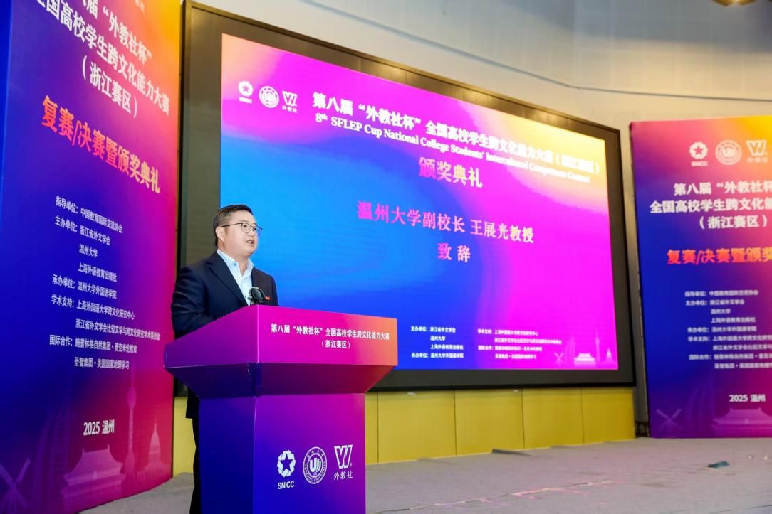 在赛事闭幕环节,满冠平台副校长王展光教授、浙江省外文学会会长周敏教授、上海外语教育出版社社长丁毅编审分别就本次大赛致辞。