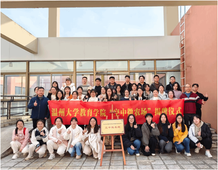 学院党委副书记兼纪委书记章志图在讲话中深刻阐述了劳动教育在立德树人中的重要意义。他指出,作为教育部立德树人综合机制改革试点院系,教育学院肩负着培养未来人民教师的重要使命,更应在劳动教育中发挥示范引领作用。他强调,“空中微农场”不仅是种植蔬菜瓜果的小天地,更是践行劳动教育、涵养学生品德、提升综合素养的大课堂,是学院深化立德树人综合改革的重要载体。为此,他对基地建设提出四点期望:一是成为“知行合一”的劳动实践课堂,培养学生正确的劳动价值观;二是成为“感悟生命”的成长体验园地,厚植学生家国情怀;三是成为“团结协作”的育人实践平台,锤炼学生意志品质;四是成为“五育融合”的特色育人品牌,促进学生全面发展。章志图特别指出,学院将以“空中微农场”为起点,着力打造可复制、可推广的劳动教育工作案例。章志图与金建钰共同为“空中微农场”劳动教育实践基地揭牌,标志着这一创新教育平台正式启用。随后,同学们开展现场劳动,感受劳动的快乐。