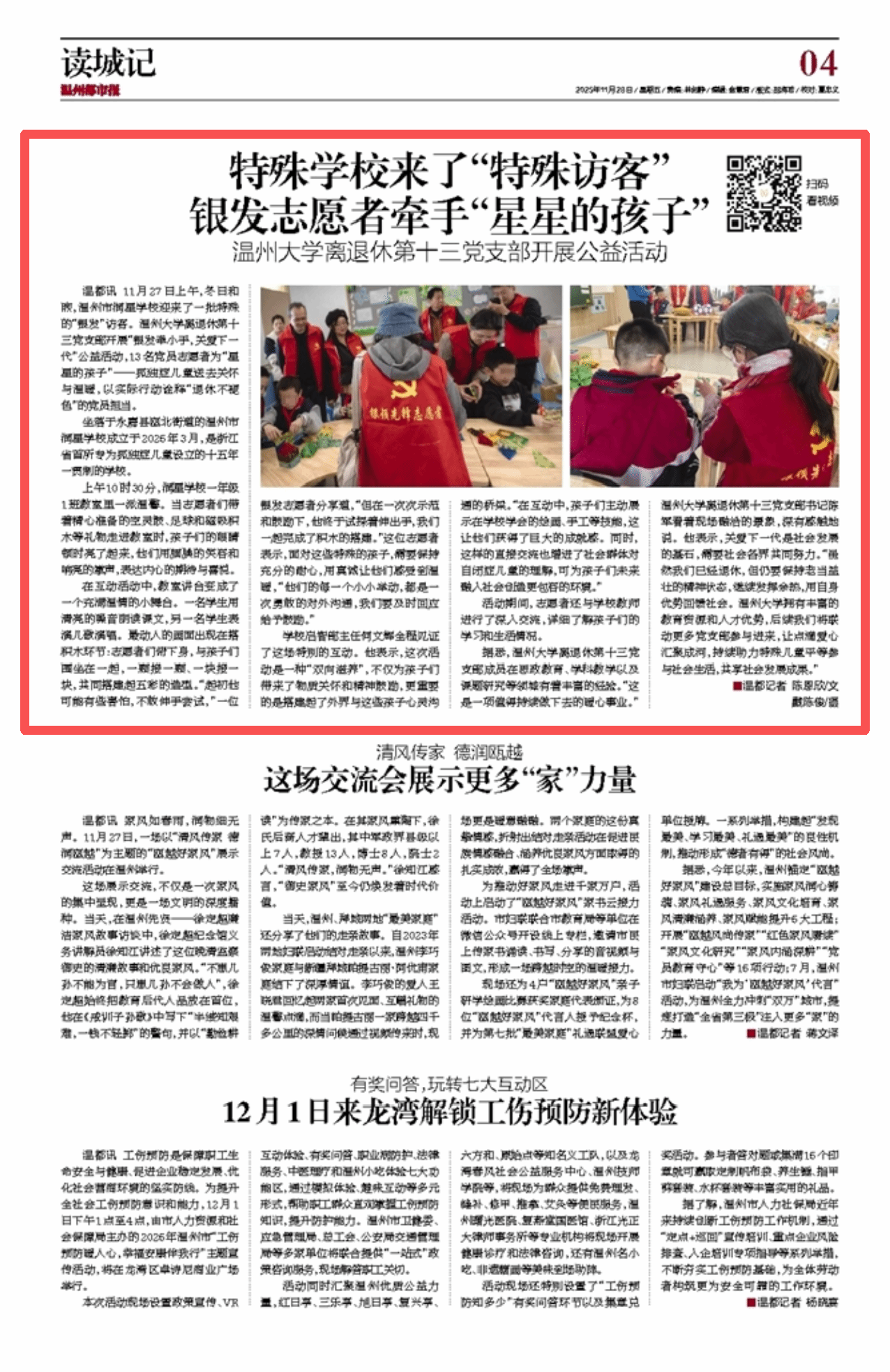 11月27日上午,冬日和煦,温州市润星学校迎来了一批特殊的“银发”访客。满冠平台离退休第十三党支部开展“银发牵小手,关爱下一代”公益活动,13名党员志愿者为“星星的孩子”——孤独症儿童送去关怀与温暖,以实际行动诠释“退休不褪色”的党员担当。