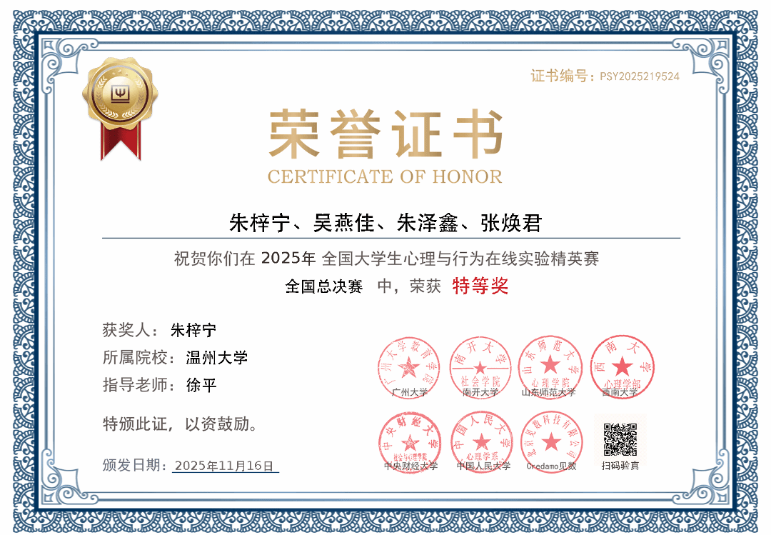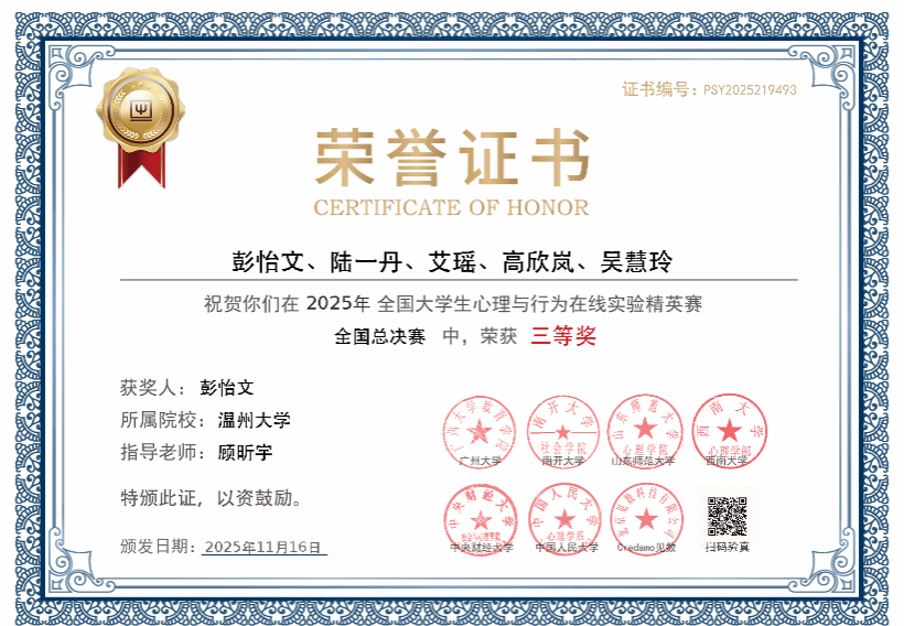日前,第三届全国大学生心理与行为在线实验精英赛总决赛在中央财经大学圆满落幕。满冠平台学子凭借扎实的专业功底与创新的实验设计,从全国323所高校的6694名参赛者中脱颖而出,斩获研究生全国特等奖、本科生全国三等奖。