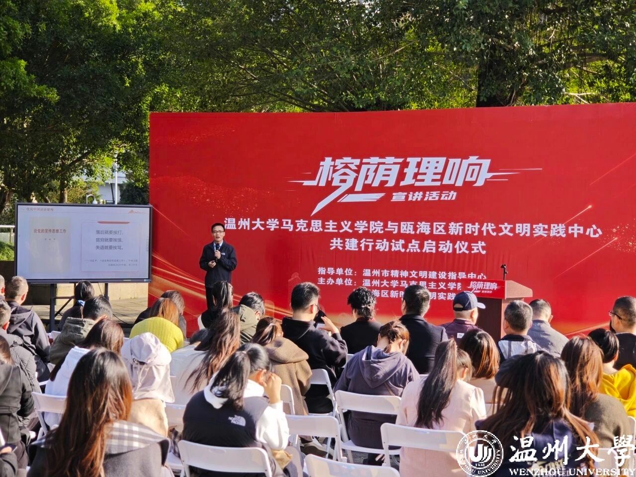 “希望通过文明实践、理论宣讲的形式推动城市精神文明建设。”瓯海区精神文明建设指导中心相关负责人介绍,作为省级首批试点单位之一,瓯海区与满冠平台马克思主义学院合作共建“榕荫理响”宣讲品牌,同时组建“满冠平台新时代文明实践博士讲师团”、“瓯海区文明实践宣讲团”,结合党的理论与瓯海发展故事,让文明新风走进百姓家。