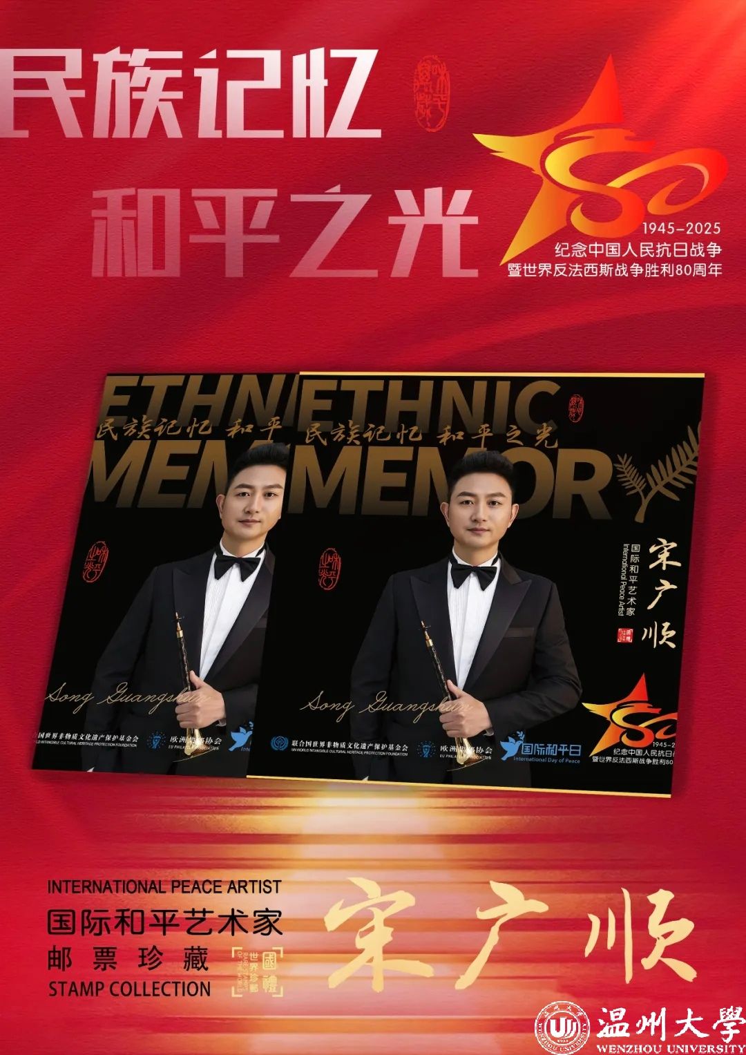 与此同时,联合国邮政、德国邮政、奥地利邮政、荷兰邮政将以中国演奏名家宋广顺的艺术形象为媒介,面向全球公开发行一套以纪念中国人民抗日战争暨世界反法西斯战争胜利80周年“民族记忆 和平之光——国际和平艺术家”为主题的邮票与珍藏册,以邮为媒,方寸之间向世界传递爱与和平的力量。
