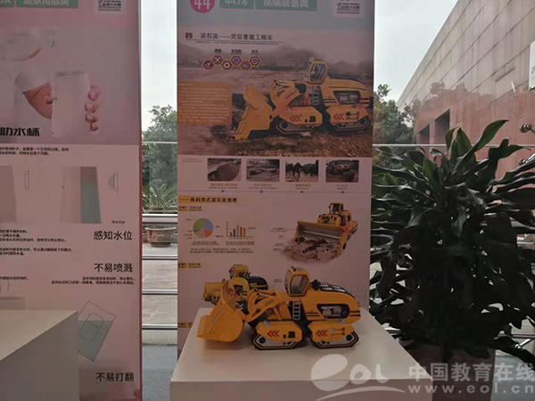 25日一早,在决赛的现场,产品展示区早已被围得水泄不通。记者观察到,参赛作品种类多样,形态各异。指甲刀、地漏这样的小物件以实物展出,而医疗仪、工程车这样的大家伙则以概念图与模型的方式与大家见面。