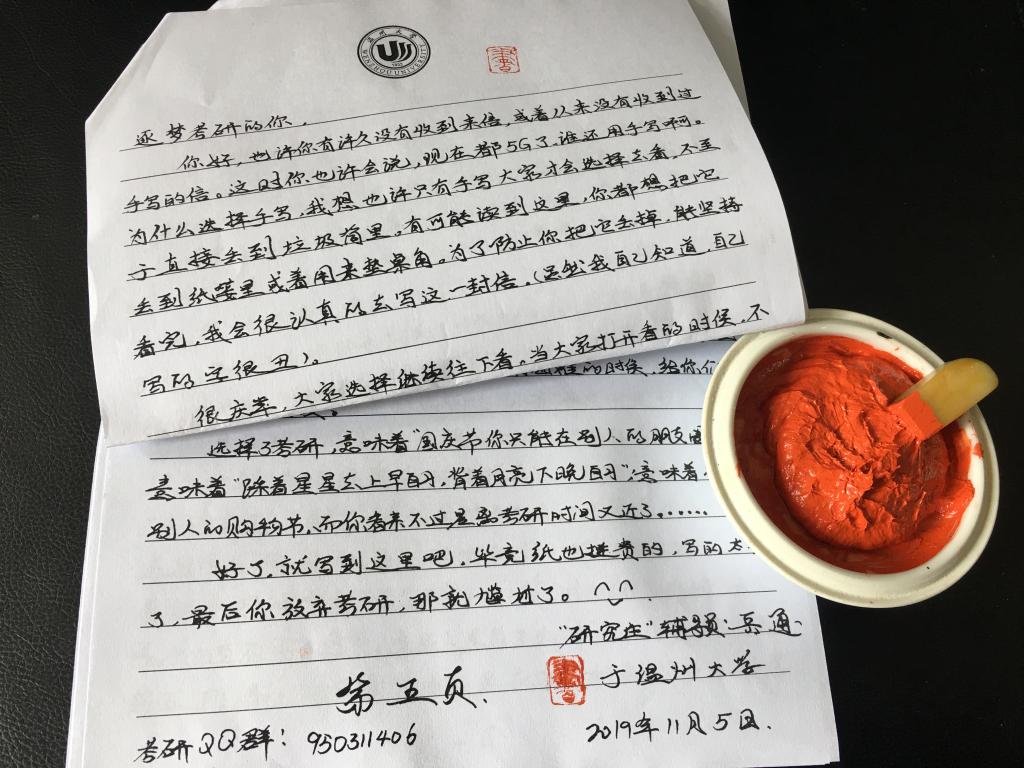 岳老师的这封特别的“双十一”快递,也给所在学院的学生带来了惊喜和温暖,同学们纷纷感谢学校和老师的用心良苦。正在备考的大三学子张宸说“拆开信封时,是惊喜,是好奇。这是一封解惑的信,通通老师用自身的真实经历,给我们讲述考研的过程,让我们更加亲切,不再惶恐;合上信封时,是感动和震撼,考研路途必然艰难,但我们一定会披荆斩棘,勇往直前。”吴泽平也感慨的说“看了岳通通老师的信,很受鼓舞,学习到了考研的精神,也复习也更加有信心了”。18级大二的任奕沛说“读完岳老师的信我懂得了考研是一条荆棘之路,会痛苦会难熬,却也值得我们走一遭,在这路上我们会遇到志同道合的朋友和更像朋友的老师,互相帮助互相扶持的日子里,那是最珍贵的回忆。”正在读大一的周宏林也表示“我虽然是大一,但是也是要立志考研的,岳老师的信,让我对考研有了一定的认识和了解,打开了我很多的疑问,我会在接下来的学习中继续努力。”