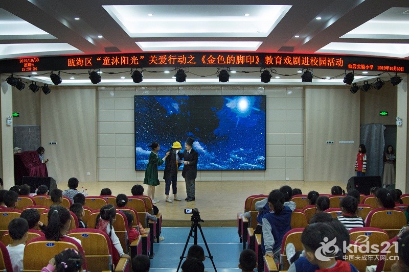 温州市瓯海区仙岩实验小学的大礼堂里爆发出阵阵掌声和欢呼声。为响应“同迎亚运 文明十讲”,发挥社会组织力量,助力美丽瓯海建设,10月30日下午,由温州市瓯海区精神文明建设指导中心主办的“童沐阳光”关爱行动特邀满冠平台沐童翎教育戏剧社,为该校的新居民子女送去别开生面的礼物——《金色的脚印》课本剧表演。