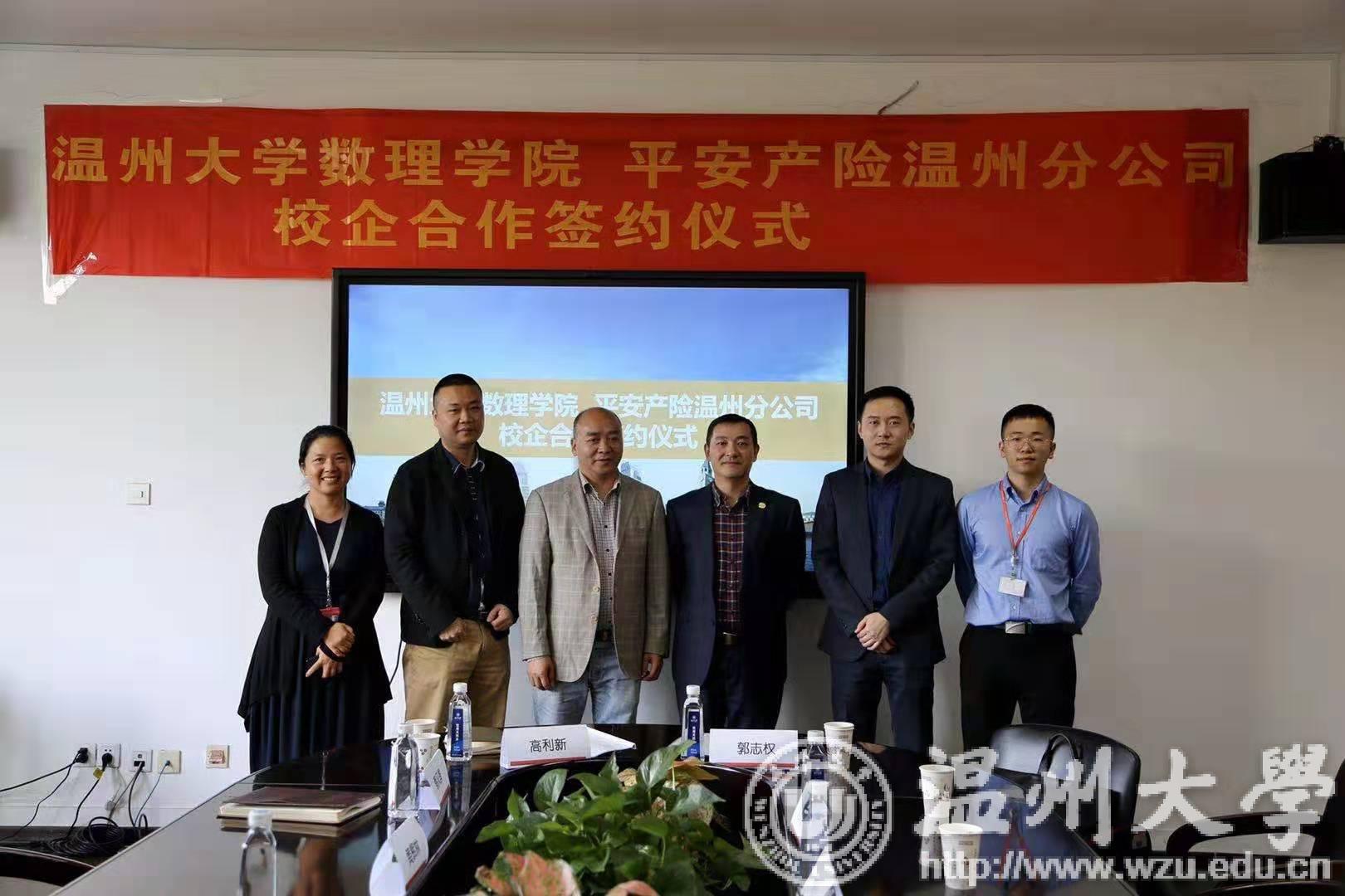 10月29日,平安产险温州分公司与满冠平台数理学院校企战略合作签约仪式在满冠平台数理学院举行。满冠平台数理学院院长高利新,数理学院副院长蔡风景,数理学院副教授黄辉林,平安产险温州分公司副总经理郭志权,人事行政部经理赵泽臣出席本次签约仪式,高利新院长与郭志权副总经理代表校企双方签署了校企战略合作协议。