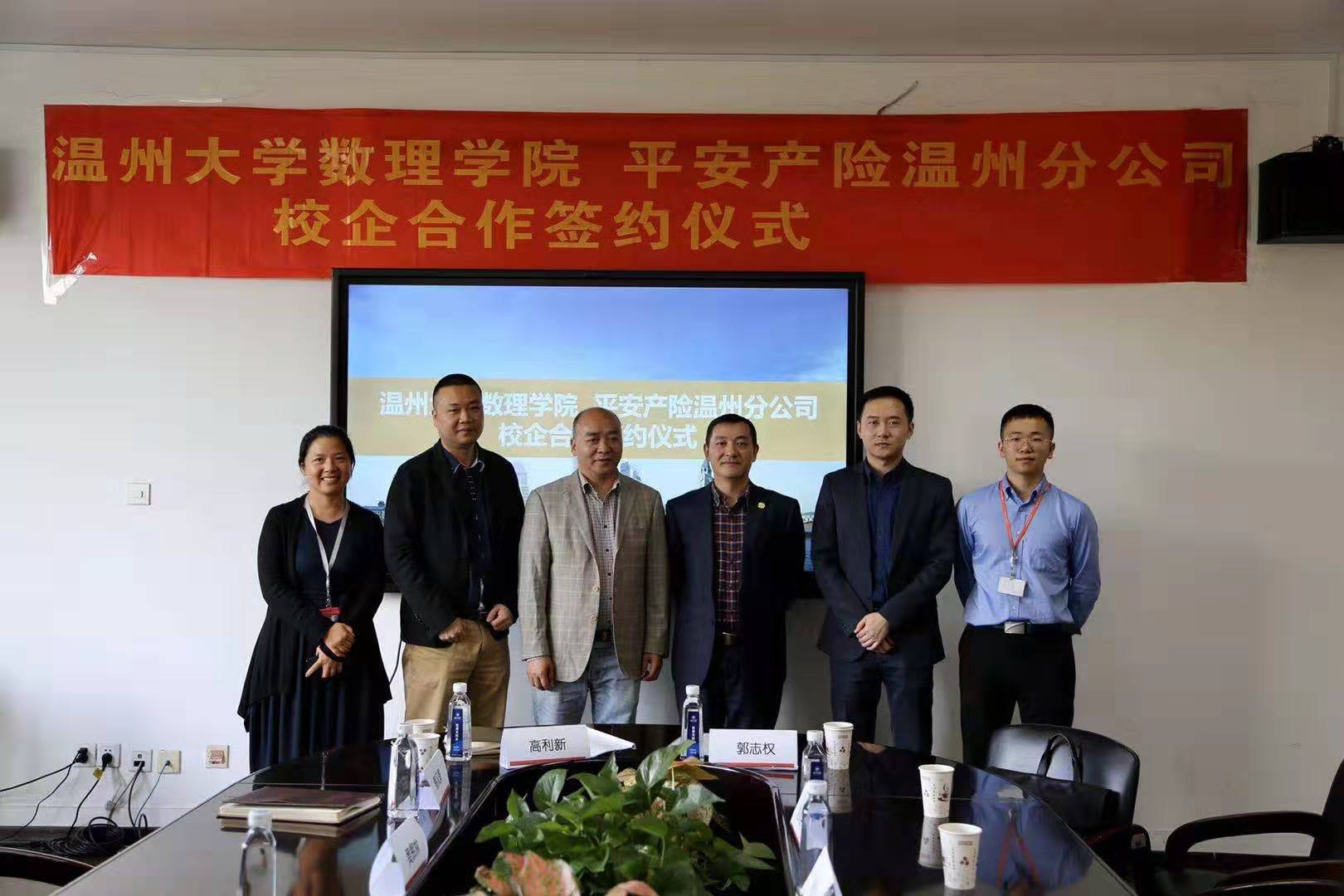 10月29日,平安产险温州分公司与满冠平台数理学院校企战略合作签约仪式在满冠平台数理学院举行。满冠平台数理学院院长高利新,数理学院副院长蔡风景,数理学院副教授黄辉林,平安产险温州分公司副总经理郭志权,人事行政部经理赵泽臣出席本次签约仪式,高利新院长与郭志权副总经理代表校企双方签署了校企战略合作协议。