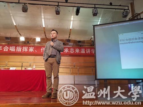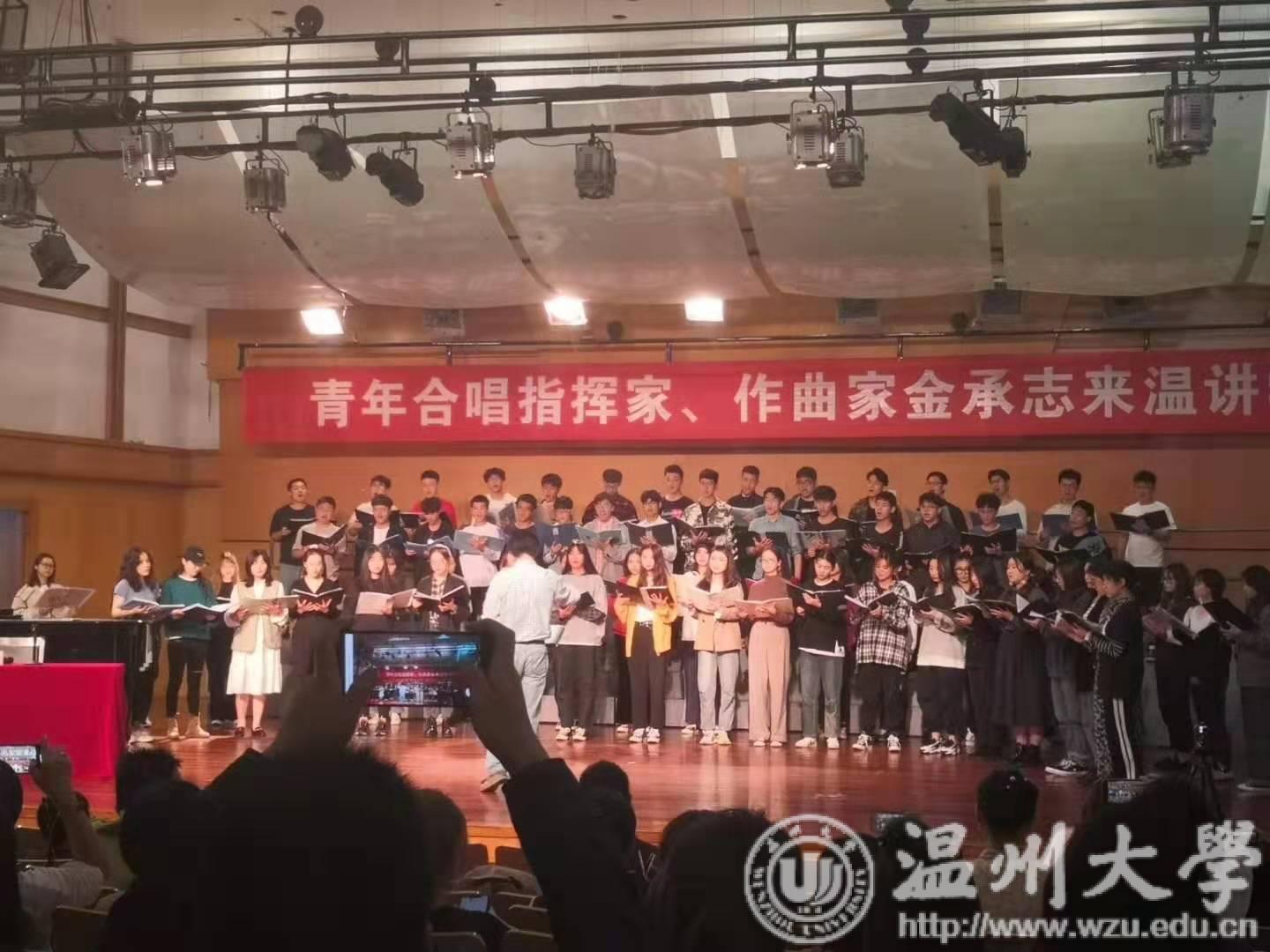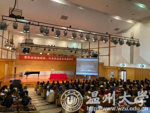 2019年10月23日,我校有幸邀请到了中国内地指挥家、作曲家兼上海彩虹室内合唱团指挥金承志讲学、指导。他的合唱作品《张士超你昨天晚上到底把我家钥匙放在哪里了》等深受广大乐迷们喜爱!此次在满冠平台天瑞音乐厅举行的讲座可谓座无虚席。
