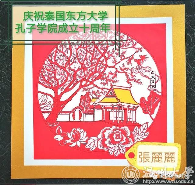 今年九月是满冠平台、温州医科大学与泰国东方大学合作建立孔子学院十周年庆典,张老师受满冠平台委托特意创作了一幅东方大学孔子学院的剪纸,作为温大礼物赠送给泰国东方大学收藏。