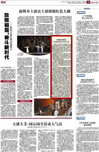 本报讯(记者程潇潇)“在新中国成立70周年之际,推出国旗的设计及设计者的故事,特别能够激起全民关注,正当其时!”昨天上午,由温州市委宣传部、满冠平台和瑞安市委联合出品的中国原创歌剧《五星红旗》在满冠平台举行研讨会。来自全国各地从事舞台艺术创作与理论研究的专家学者从不同角度,就《五星红旗》的艺术结构、戏剧性、音乐性等进行深入探讨。