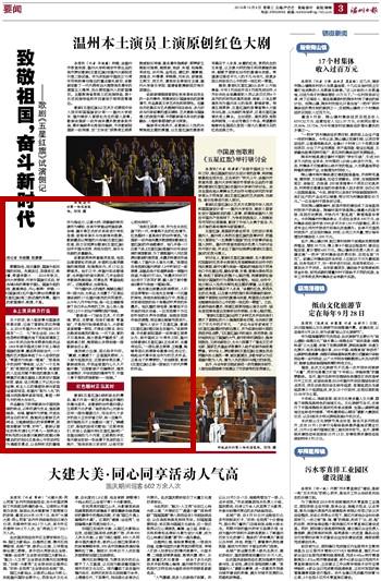 “温州人设计了五星红旗,歌剧《五星红旗》理应诞生在温州。”该剧导演、中央歌剧院国家一级导演王湖泉认为,新中国成立70周年之际,温州创排歌剧《五星红旗》正当其时,且富有远见。“一部弘扬主旋律、正能量,能够带观众回溯革命激情与红色记忆,唤起当代青年担当作为的艺术作品,正是当下所需要的。”在他眼里,歌剧《五星红旗》正是一部被这个时代所需的作品。