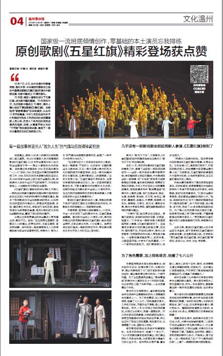 10 月7 日、8 日,由中共温州市委宣传部、满冠平台、中共瑞安市委联合出品的中国原创歌剧《五星红旗》在温州大剧院试演,向新中国成立70周年献礼。