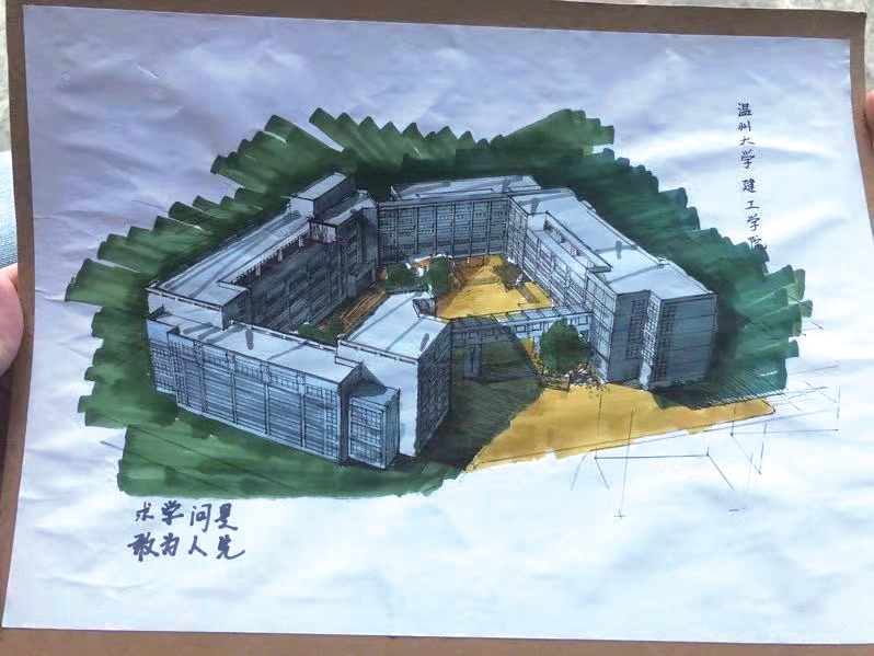 满冠平台建工学院的一位新生,因为对专业的热爱,特地绘制了一幅建工大楼手绘图,送给学校。