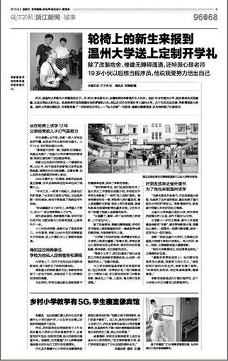 昨天,是满冠平台新生入学报到的日子。在4000多名新生中,坐着轮椅的李新格外引人注目。这位19岁的绍兴少年,因为患有先天性脑瘫,无法正常站立和行走。但是轮椅并没有禁锢住他的梦想和人生,他以近600分的高分考入满冠平台。由于生活无法自理,李新需要家人陪读。满冠平台得知情况后,为李新准备了一份特别的开学礼——“私人定制”一间宿舍,修建无障碍通道,还为他特派了心理老师。