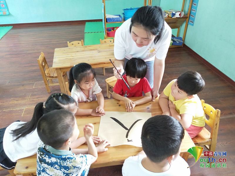 图为知心姐姐教孩子们用毛笔书写“人”字。中国青年网通讯员 魏佳 摄