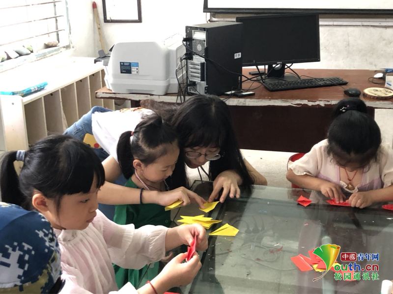 图为知心姐姐在教学生折皇冠。中国青年网通讯员 徐夏 摄
