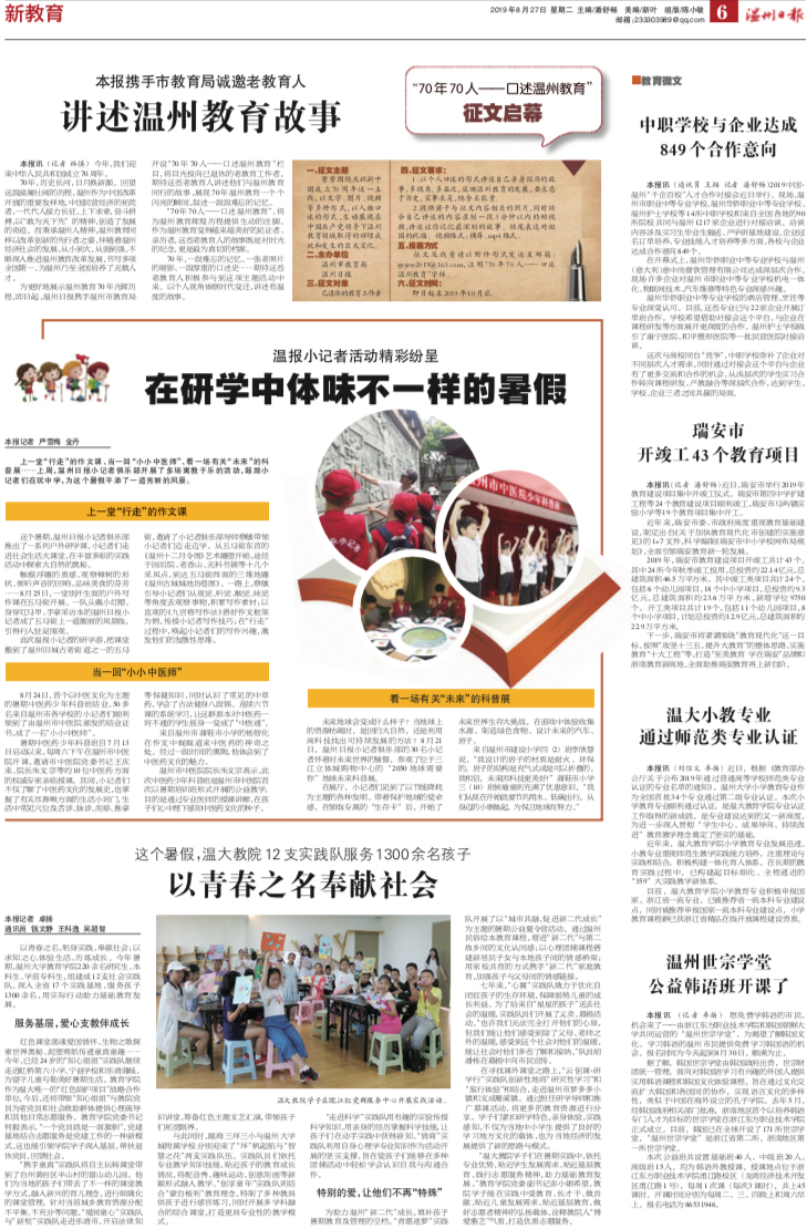 近年来,温大教育学院小学教育专业发展迅速。小教专业重视师范生教学实践能力培养,注重理论与实践相结合,积极构建一体化育人体系,在长期的教育实践过程中,已构建起目标细化、全程递进的“359”大实践教学新体系。 目前,温大教育学院小学教育专业积极申报国家、浙江省一流专业,已被推荐省一流本科专业建设点,同时被推荐申报国家一流本科专业建设点,小学教育课程群已获浙江省精品在线开放课程建设资质。