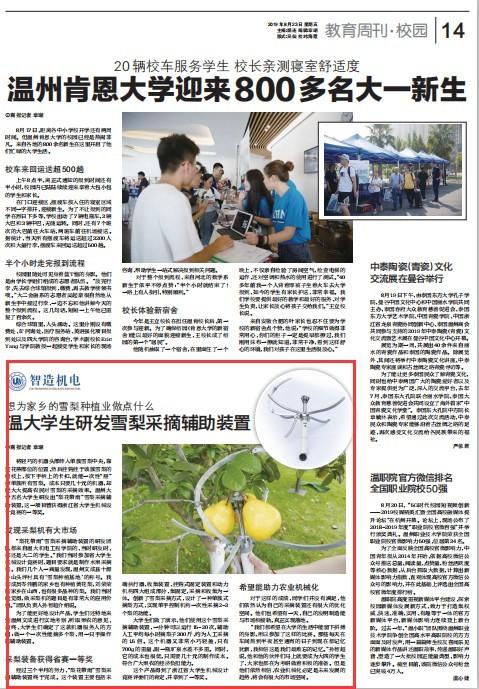 发现采梨机有大市场“梨花带雨”雪梨采摘辅助装置的研发团队都来自温大机电工程学院的,当时研发时,都还是大二的学生。“我们当时参加省大学生机械设计竞赛时,题目要求就是制作水果采摘机。我们几个人一商量发现,温州文成县十源乡山头坪村具有‘雪梨种植基地’的称号。我和成员岑伟鹏的家乡也有种植黄花梨,刘荣荣的家乡在山西,也有很多品种的梨。我们当时就觉得,做采梨机的题目是有非常大的应用价值。”团队负责人孙智超介绍说。
