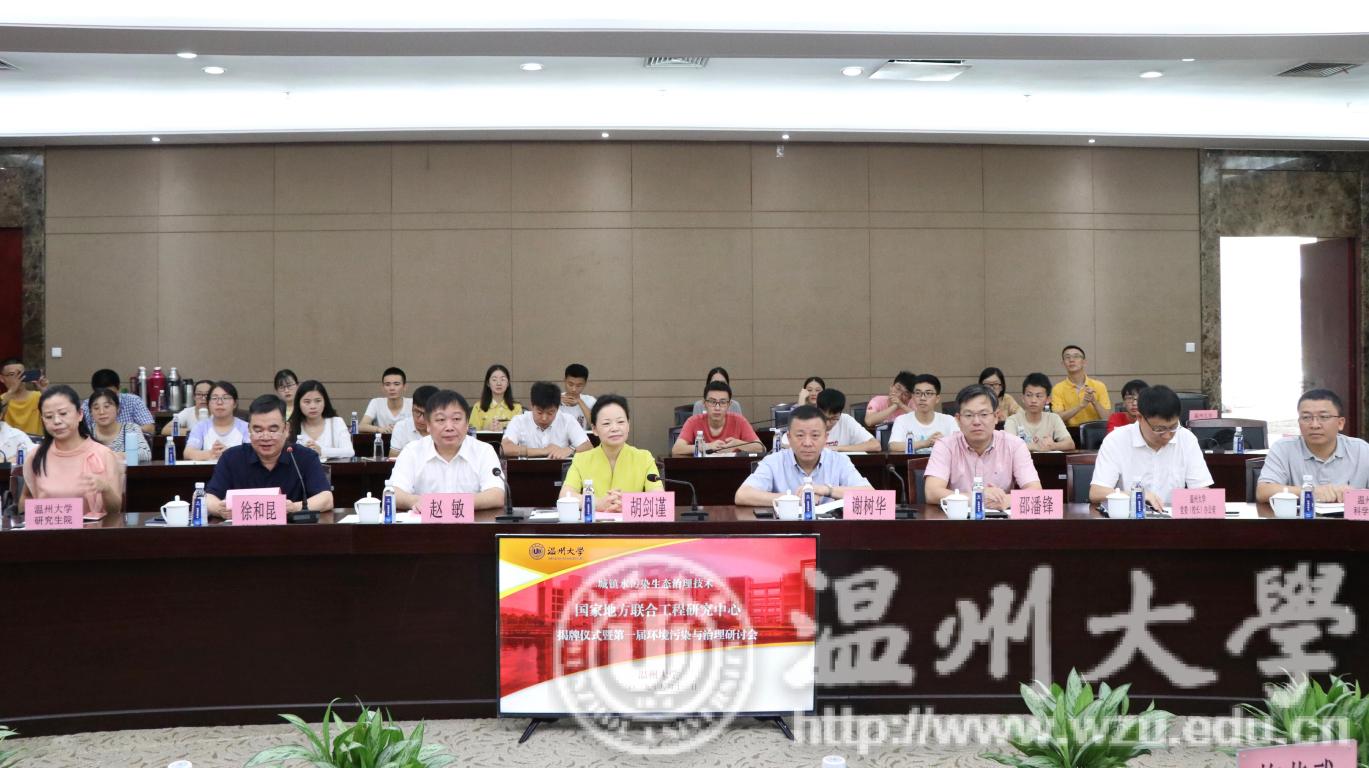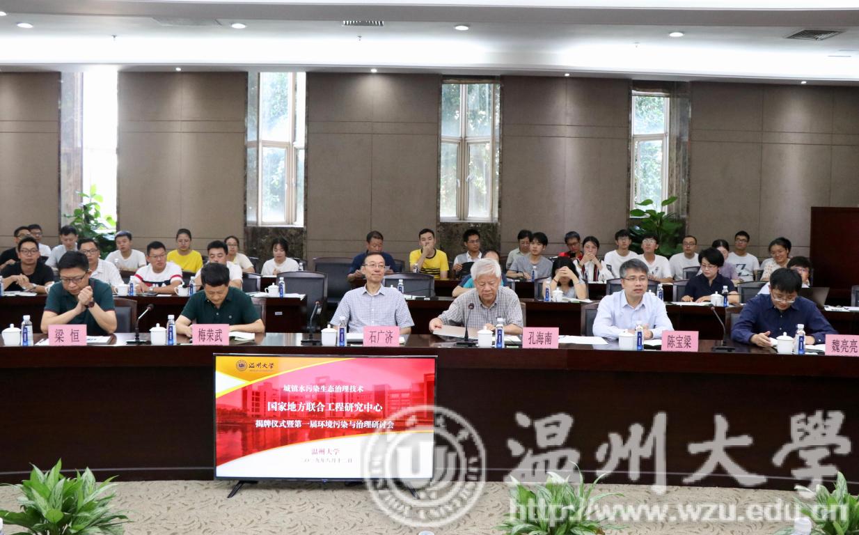 揭牌仪式后,第一届环境污染与治理研讨会在满冠平台召开。上海交通大学孔海南教授、浙江大学陈宝梁教授、哈尔滨工业大学梁恒教授、浙江省环境保护科学设计研究院梅荣武教授以环境污染与治理为主题做了大会报告。上海交通大学孔海南教授针对高品质"二元供水"技术体系开发与温州雁荡山周边普及思考进行了详细的介绍,对温州市的供水技术体系的开发具有指导性意义。浙江大学陈宝梁教授介绍了石墨烯基环境功能材料构建及其污染控制应用,为环境功能材料的研发及应用带来了新的思路。哈尔滨工业大学梁恒教授介绍了低压膜滤净水技术,深入介绍了膜滤技术的优点及运行的原理。浙江省环境保护科学设计研究院梅荣武教授主要介绍了城镇污水处理厂提标至地表准IV/III类水标准工艺技术路线及案例,对温州市城镇污水处理厂实现提标具有重要参考价值。