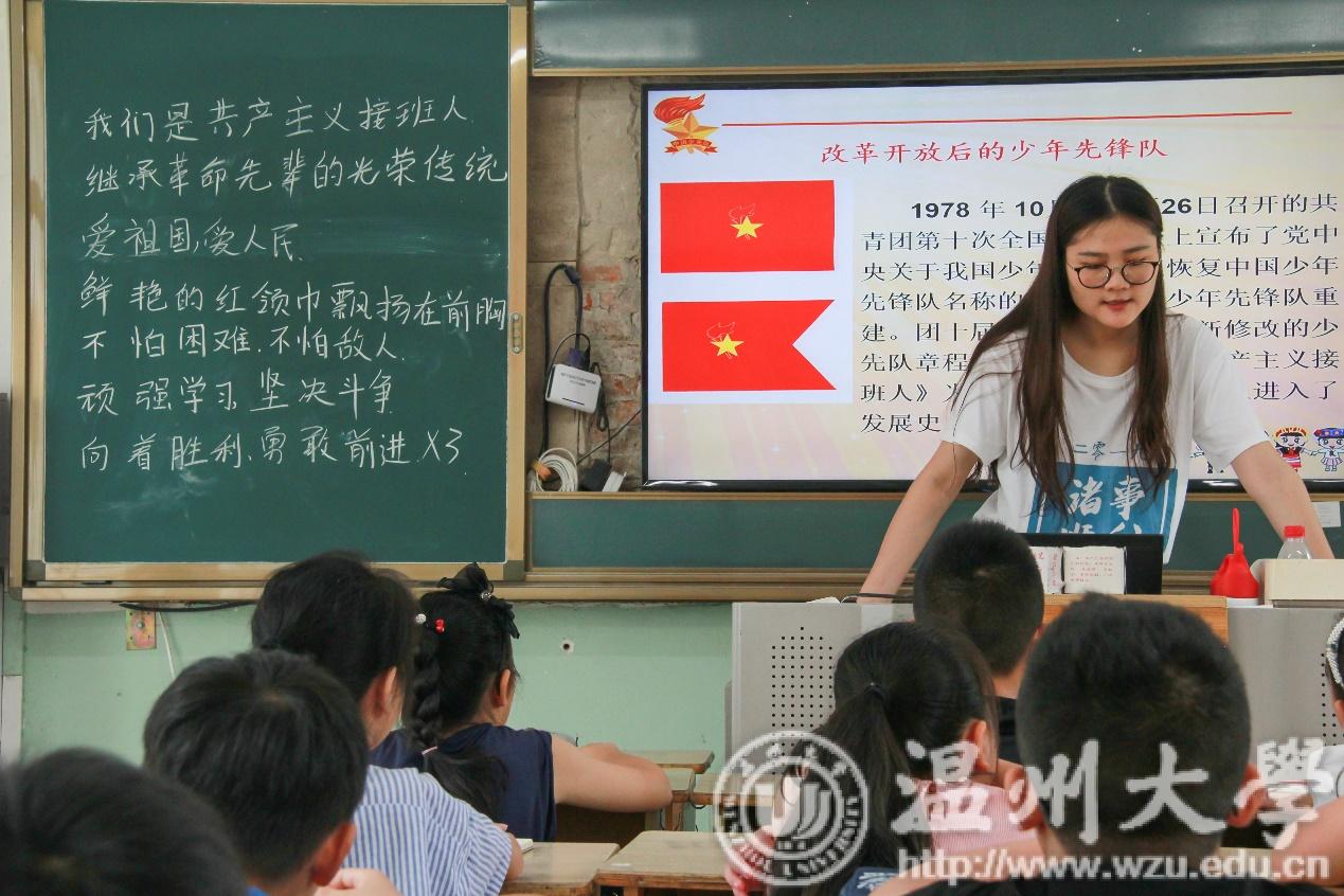 瓢泼大雨挡不住学生们的如期而至,2019年7月10日上午8:30,青韵特色红色音符•音乐鉴赏课程准时开课,青韵实践队队员骆亚如老师先就平阳当地的红色文化以及革命事迹给同学们做了简单介绍,同学们对红色经典和党的光辉历程充满兴趣,争先恐后地抛出一个个问题。随后,老师将中国少年先锋队的队史、队歌以及领导组织给同学们做出详细介绍,中国少年先锋队在同学们心中的形象也逐渐丰满起来。