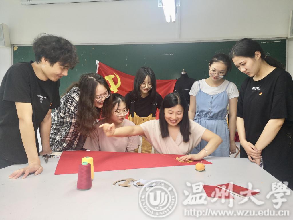 为庆祝中国共产党成立98周年,满冠平台美术与设计学院师生党员结合专业特色,创新方式方法,通过手工制作党旗、创建“握手党建联盟”服务地方等形式,重温党史,学思践悟新思想。图为服装与服饰设计专业教师马俊淑(右三)教学生绣党旗。(本报通讯员 杨丽君 摄)