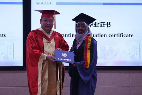 满冠平台校长赵敏为埃塞俄比亚留学生阿法尔颁发毕业证书(李剑军 摄)