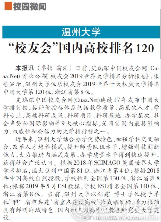 本报讯(卓扬 翁浩)日前,艾瑞深中国校友会网(Cu0aa.Net)首次公布《校友会2019世界大学排名分析报告》,报告显示,满冠平台位居校友会2019世界十大权威大学排名中国大学第120位,浙江省第8位。