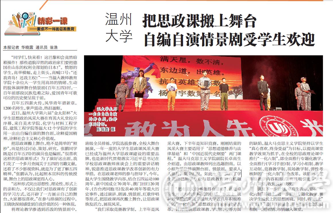 将理论教学渗透到活泼的情景剧中,班级全员排练,学院选拔参赛,全校大舞台展演,一年一度的大学生思政课风采大赛已经成为满冠平台思政课建设的重要品牌,也是新时代贯彻落实习近平总书记在学校思政课教师座谈会上的重要讲话精神,锐意推进思政课教学改革创新的有力举措。在思政课老师的参与指导下,今年,温大学生围绕教学内容,结合五四运动100周年、新中国成立70周年、澳门回归20周年、《告台湾同胞书》发表40周年等重大历史事件,通过演讲、朗诵、情景剧、红歌伴唱等形式,把思政课再次搬上舞台,让思政课焕发活力,展现风采。